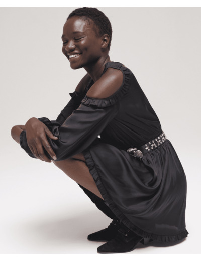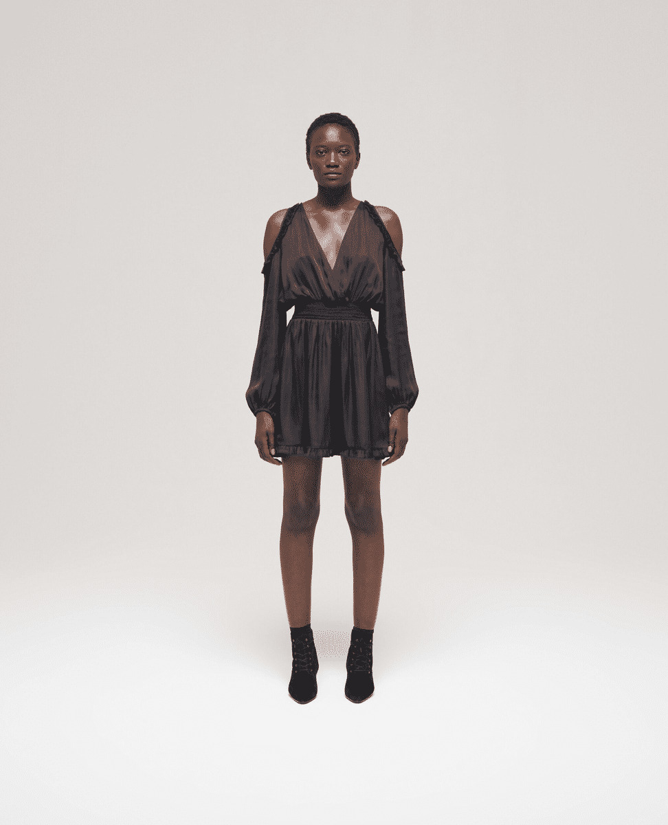 Sublimez votre silhouette avec cette robe courte manches longues off shoulder, un équilibre parfait entre audace et élégance. The Kooples signe une pièce qui capte tous les regards sans effort.