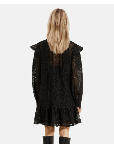 La robe mesure 90 cm de long pour une taille 36. Elle présente un col rond, des manches longues, un mélange de dentelles et des détails de volants qui ajoutent du relief à la pièce. Entretien et composition disponibles sur demande.