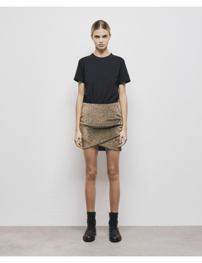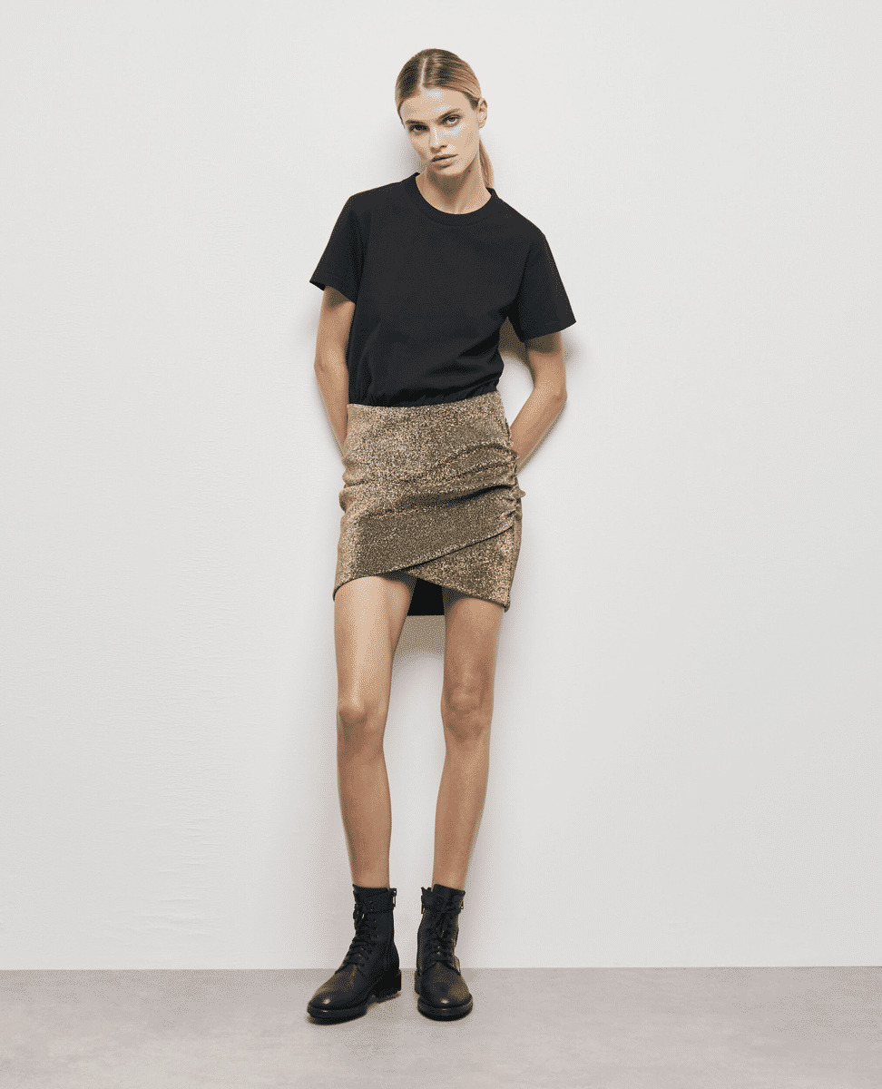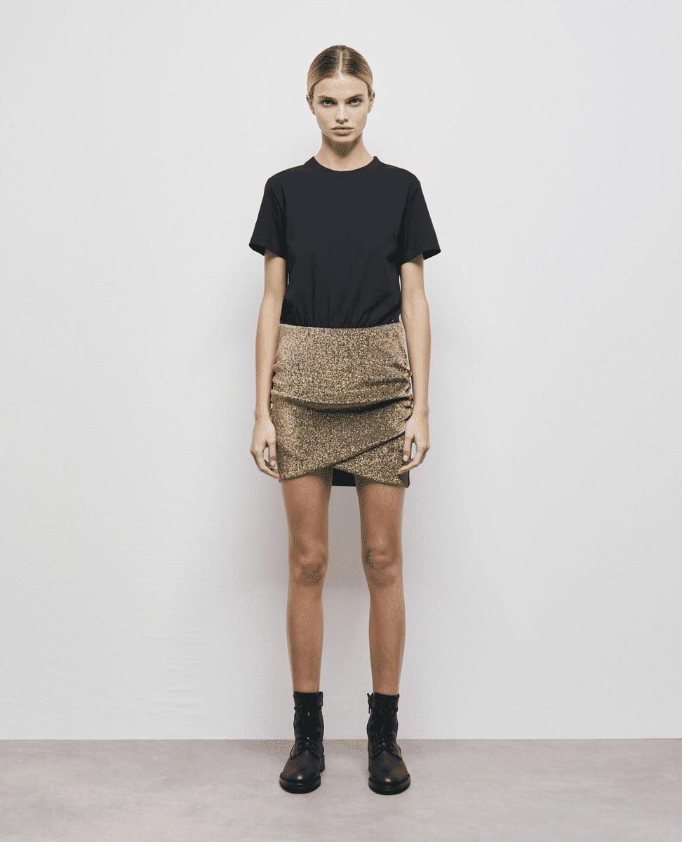Le haut en jersey coton épouse délicatement la silhouette tandis que la jupe drapée en lurex doré apporte une touche glamour et sophistiquée. Cette pièce signée The Kooples joue sur les textures et les volumes pour un look à la fois audacieux et raffiné, parfait pour vos événements festifs ou vos sorties chics.