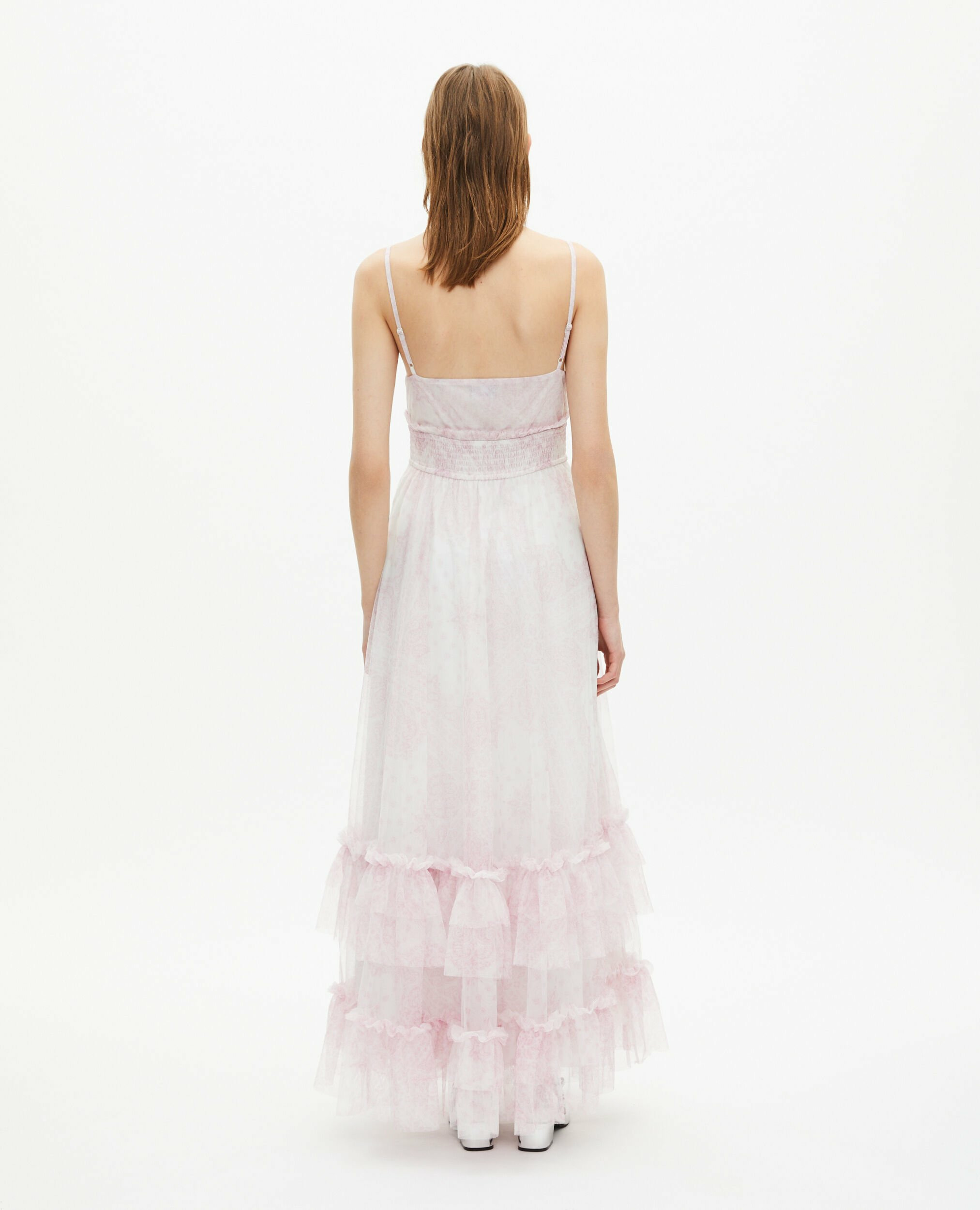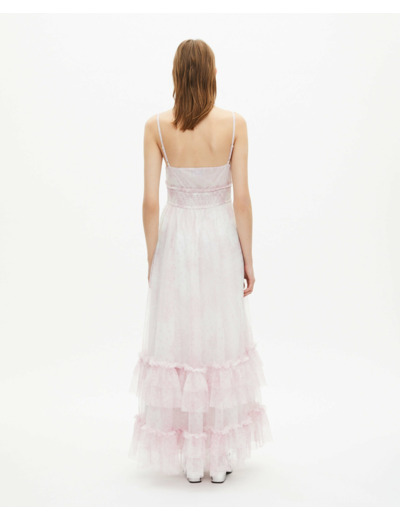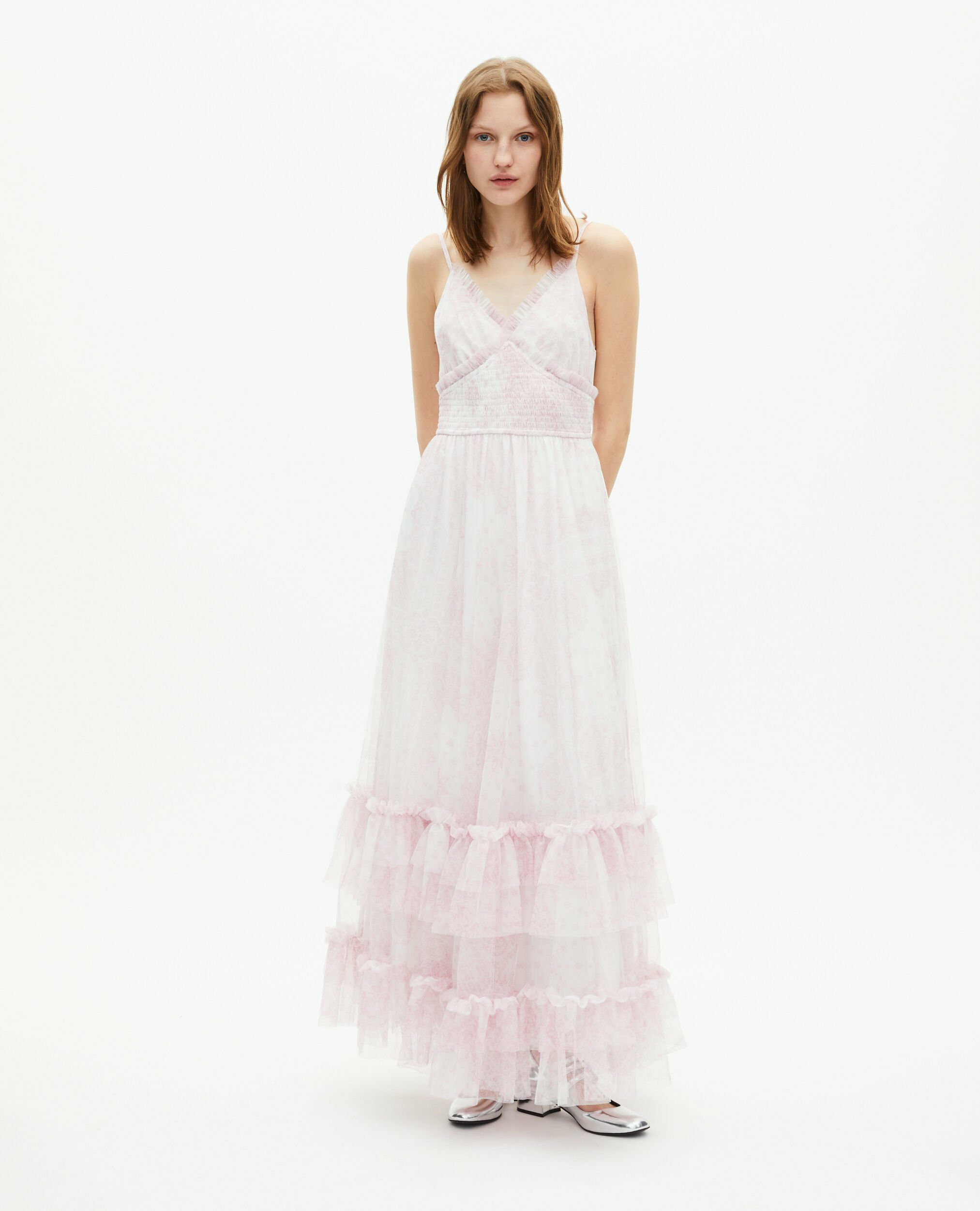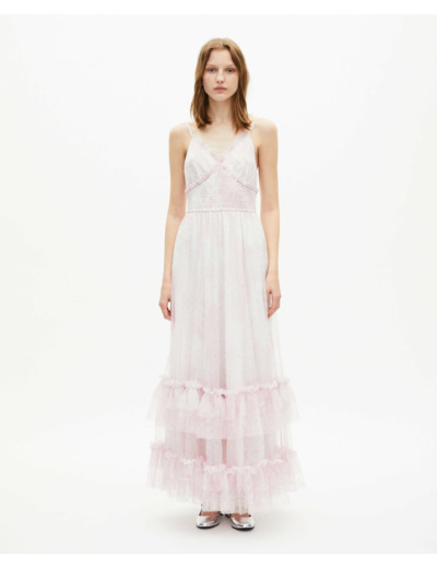 Robe femme The Kooples en tulle, imprimé Pale Lilac. Coupe ample ajustée à la taille avec taille empire smockée. Fines bretelles réglables, décolleté en V. Bas à volants. Longueur 132 cm pour une taille 36.