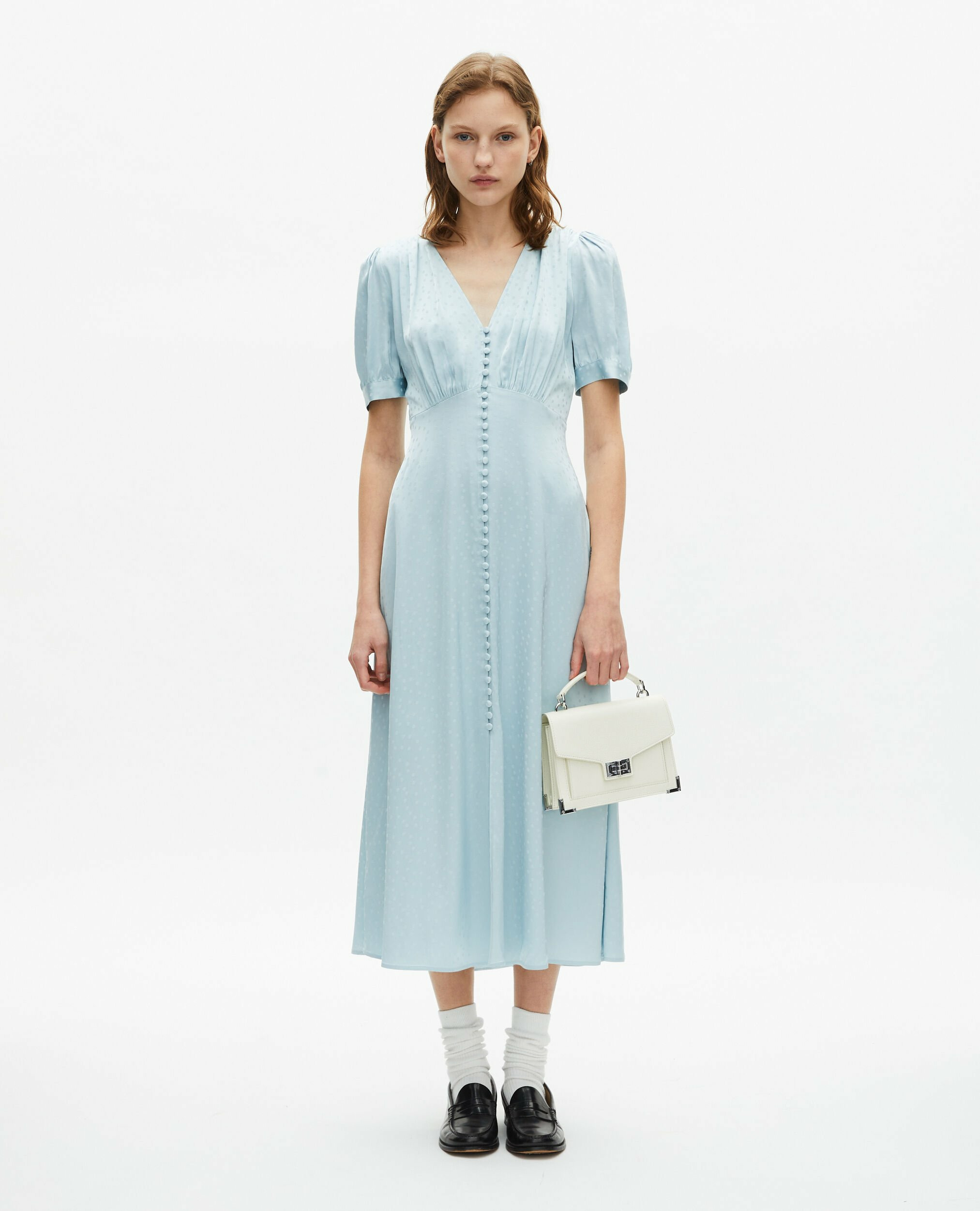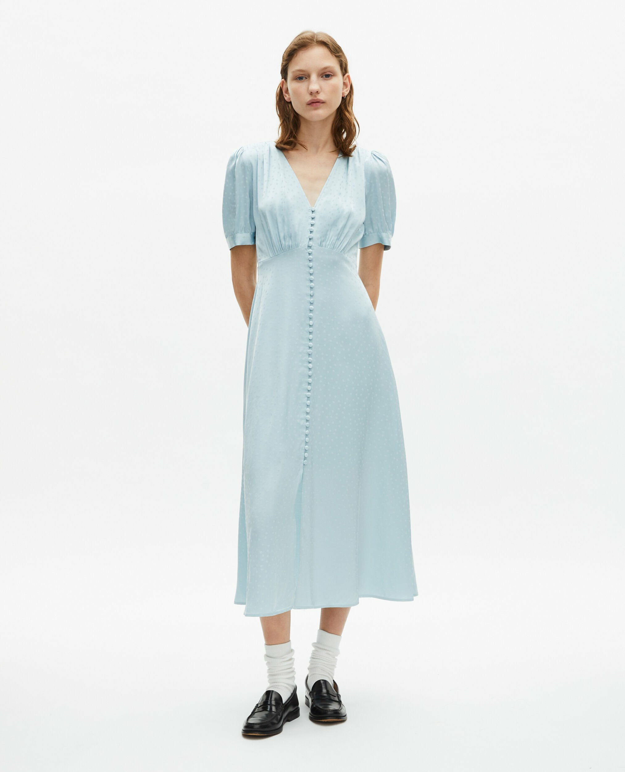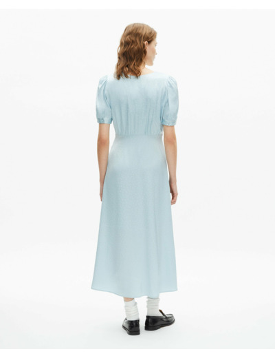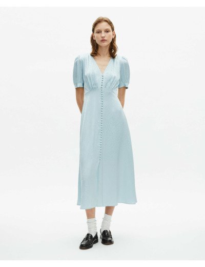 Conçue pour épouser parfaitement la taille grâce à sa coupe empire ajustée, cette robe fluide dévoile une fente frontale qui souligne le mouvement avec grâce. Les manches courtes et les boutons recouverts ajoutent un détail raffiné, tandis que le zip invisible sur le côté garantit un porté confortable et une finition impeccable.