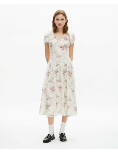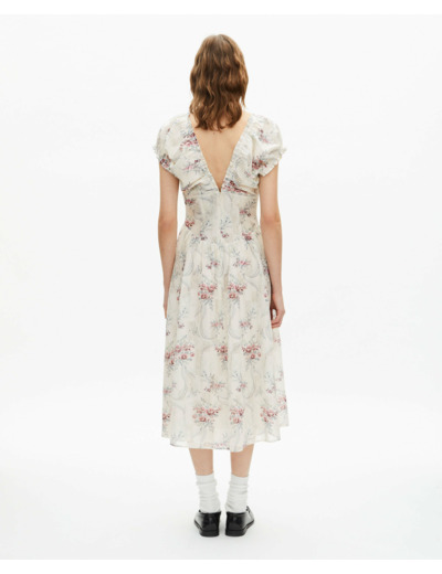 Question ? Cette robe convient-elle pour une occasion formelle ? Réponse. Oui, son design élégant et son imprimé floral sophistiqué la rendent adaptée aussi bien aux événements formels qu’aux sorties décontractées.