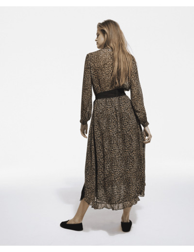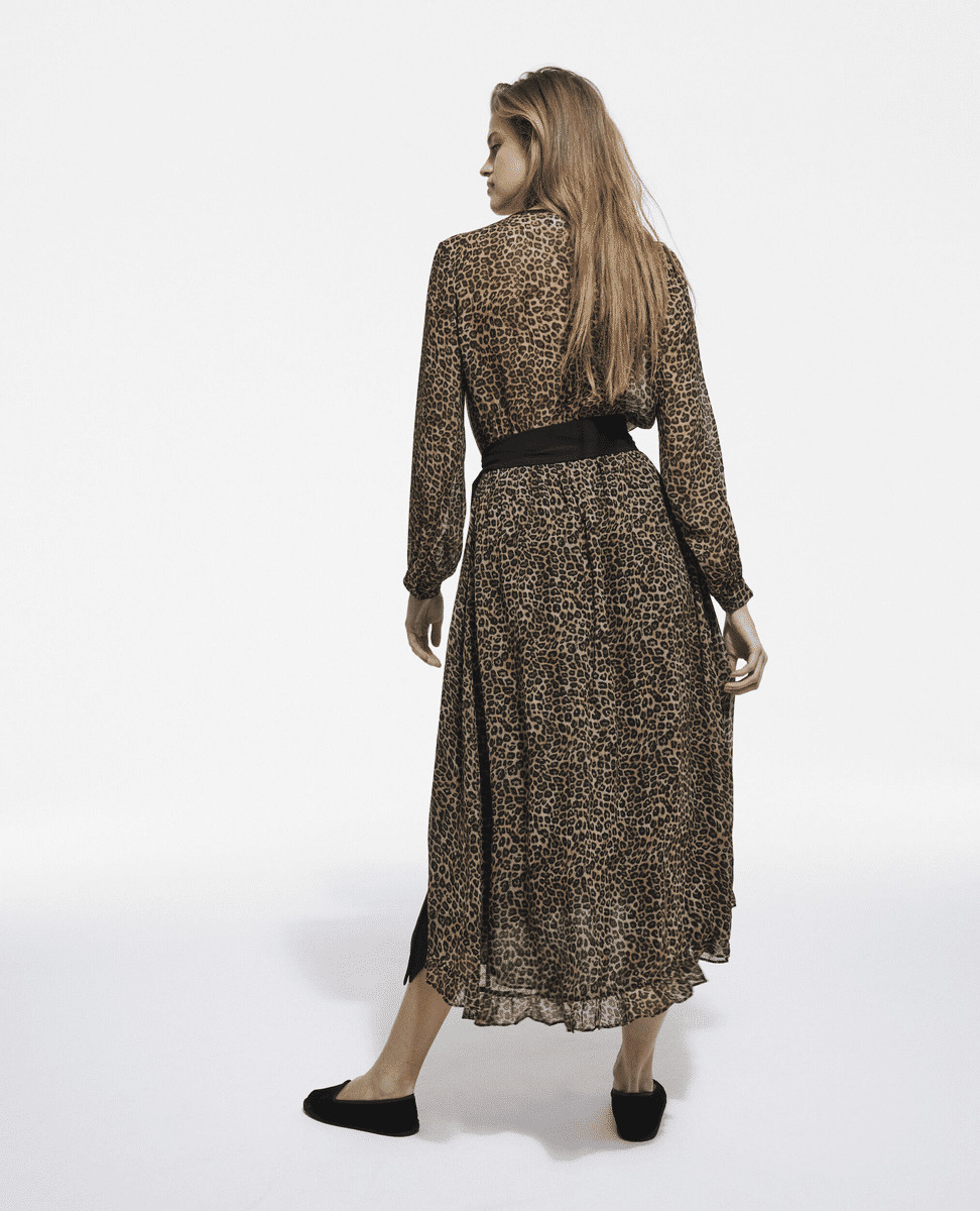 Conçue en viscose légère, cette robe épouse délicatement le corps tout en offrant un confort optimal. Sa coupe longue et fluide met en valeur chaque mouvement, idéale pour des occasions où élégance rime avec liberté. Le motif petit léopard ajoute une note moderne et raffinée, parfaite pour affirmer votre style avec subtilité.