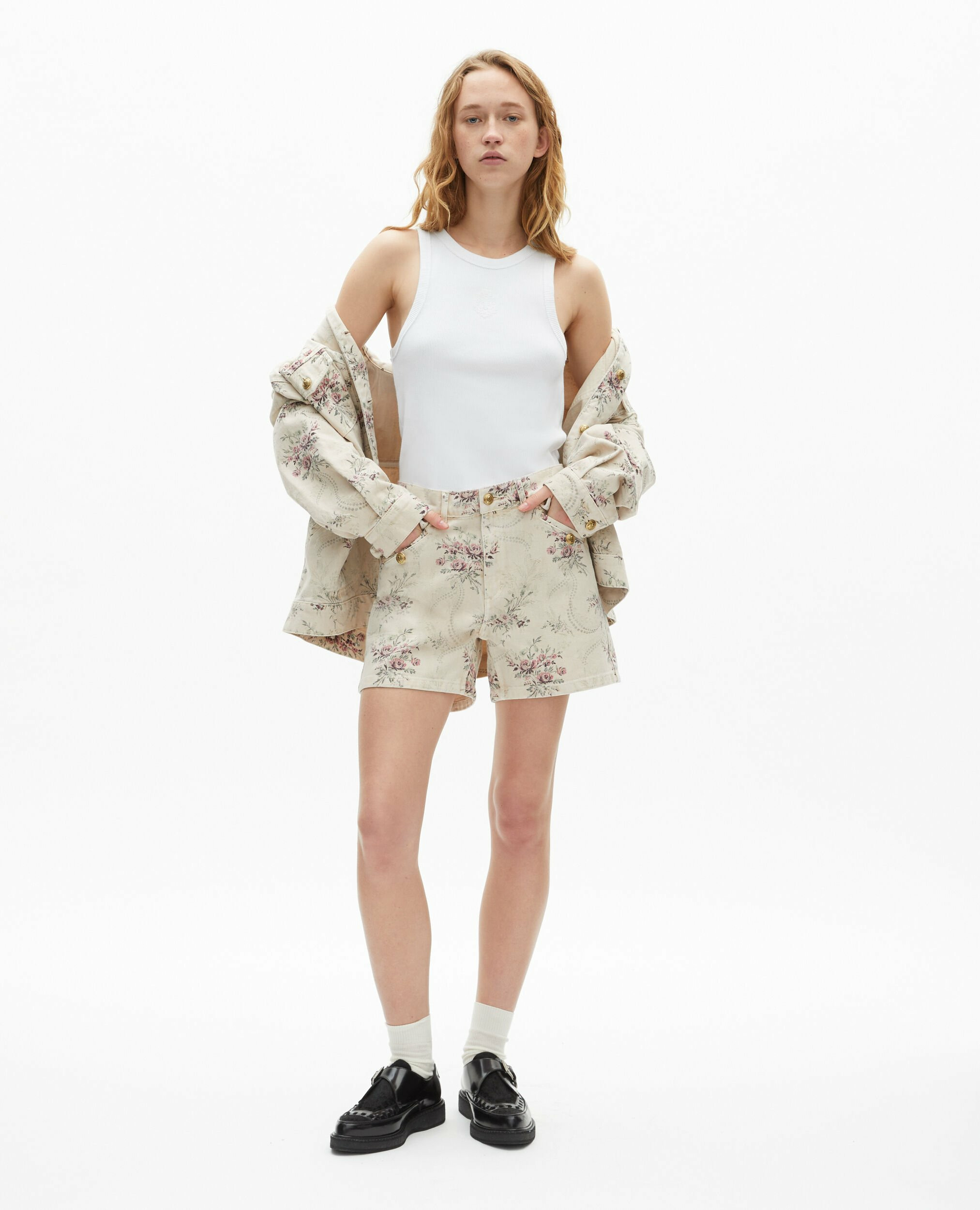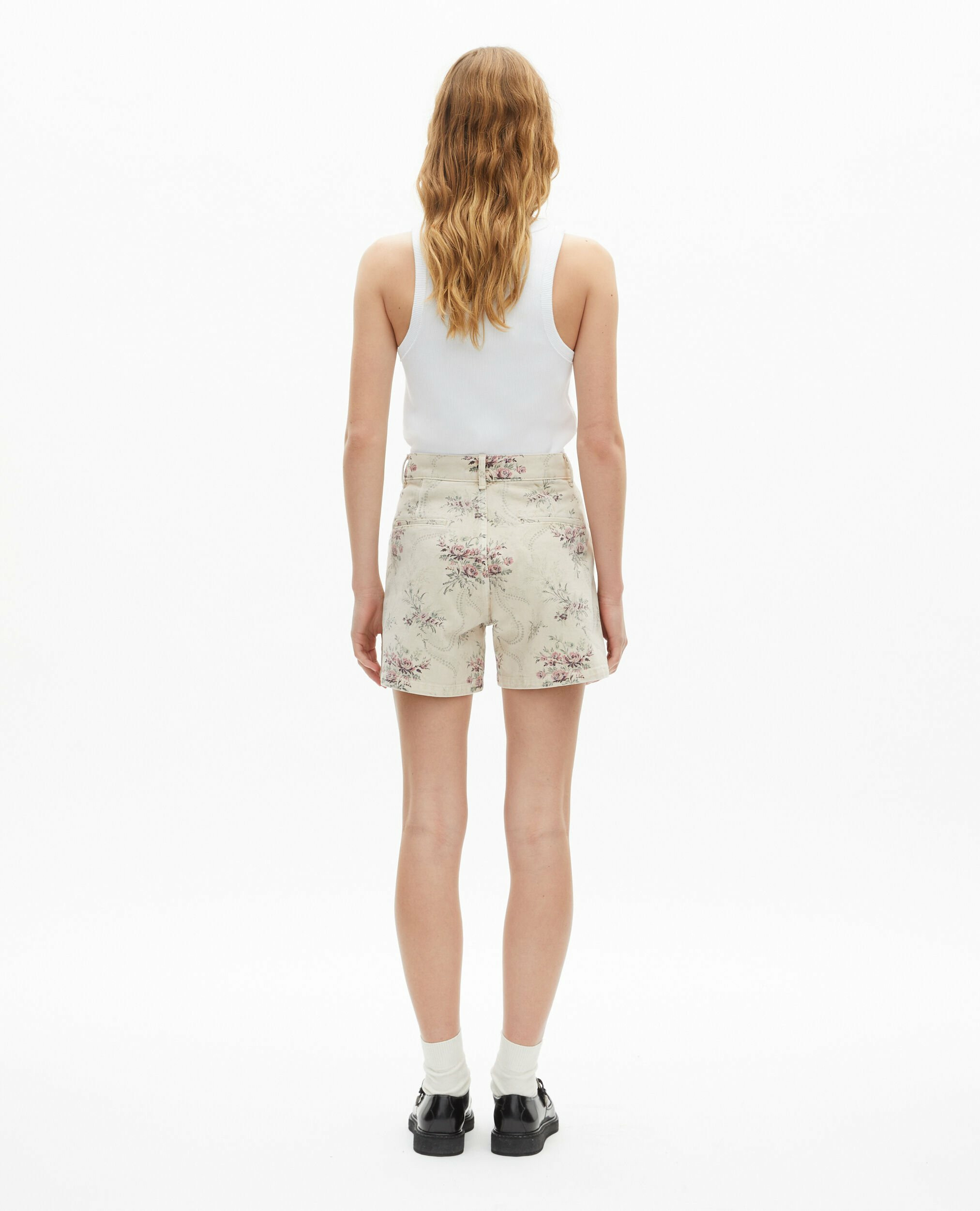 Short femme en coton avec imprimé floral 'Antik flowers'. Taille avec passants, coupe large. Poches à rabat et poches arrière passepoilées. Boutons jean héritage.