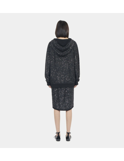 Composition et entretien : maille noire, sequins. Lavage à la main recommandé pour préserver l’éclat des sequins et la qualité du tissu.