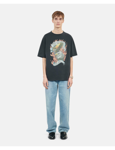 Confectionné en coton délavé, ce t-shirt The Kooples offre une texture douce et un effet vintage qui évolue avec le temps. Le col rond et les manches courtes apportent une silhouette décontractée, tandis que la sérigraphie frontale Eagles On Fire ajoute une touche rock et authentique, parfaite pour un look urbain affirmé.