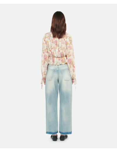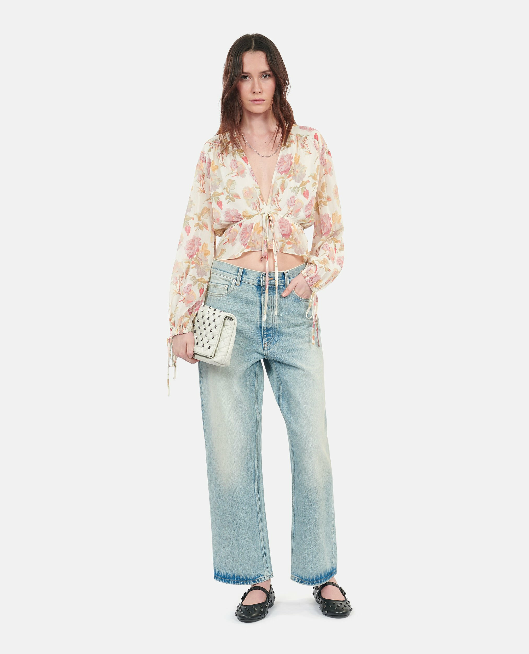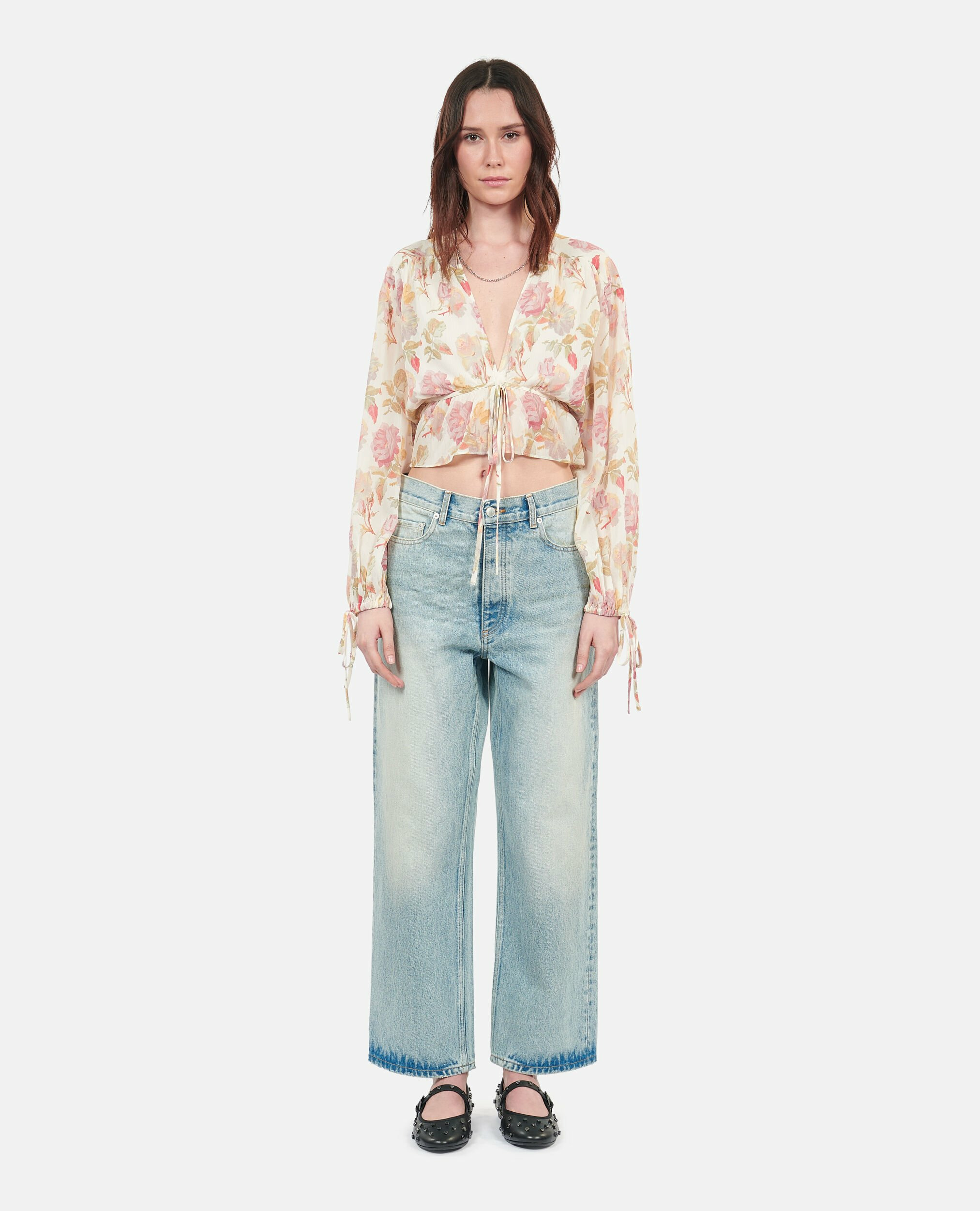 Confectionné dans une soie fluide et légère, ce top court offre une coupe ample qui épouse vos mouvements avec grâce. Son col en V souligné par un laçage ajustable et ses manches longues ornées de détails similaires créent un jeu de textures et de volumes, parfait pour affirmer votre style en toute occasion.