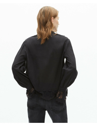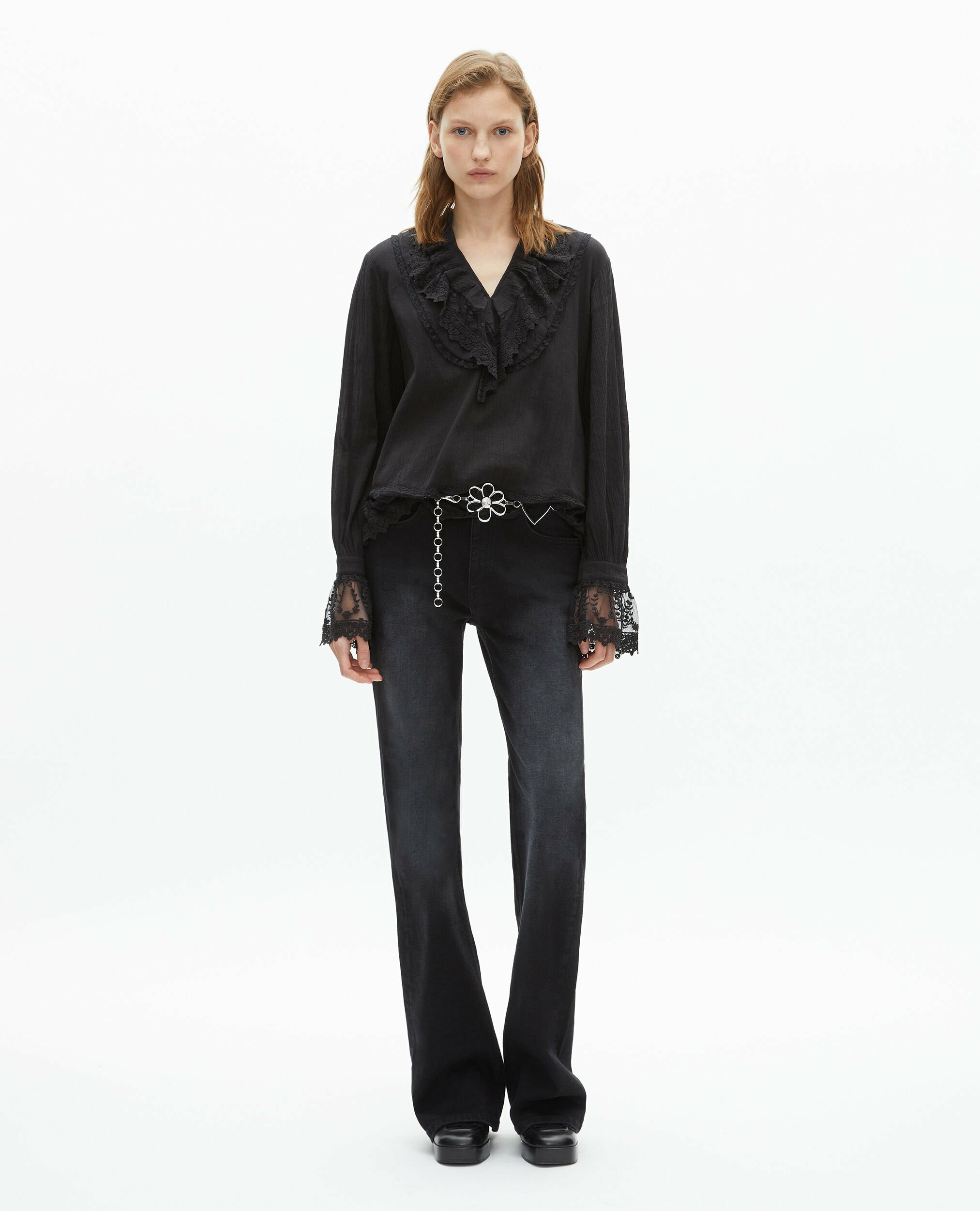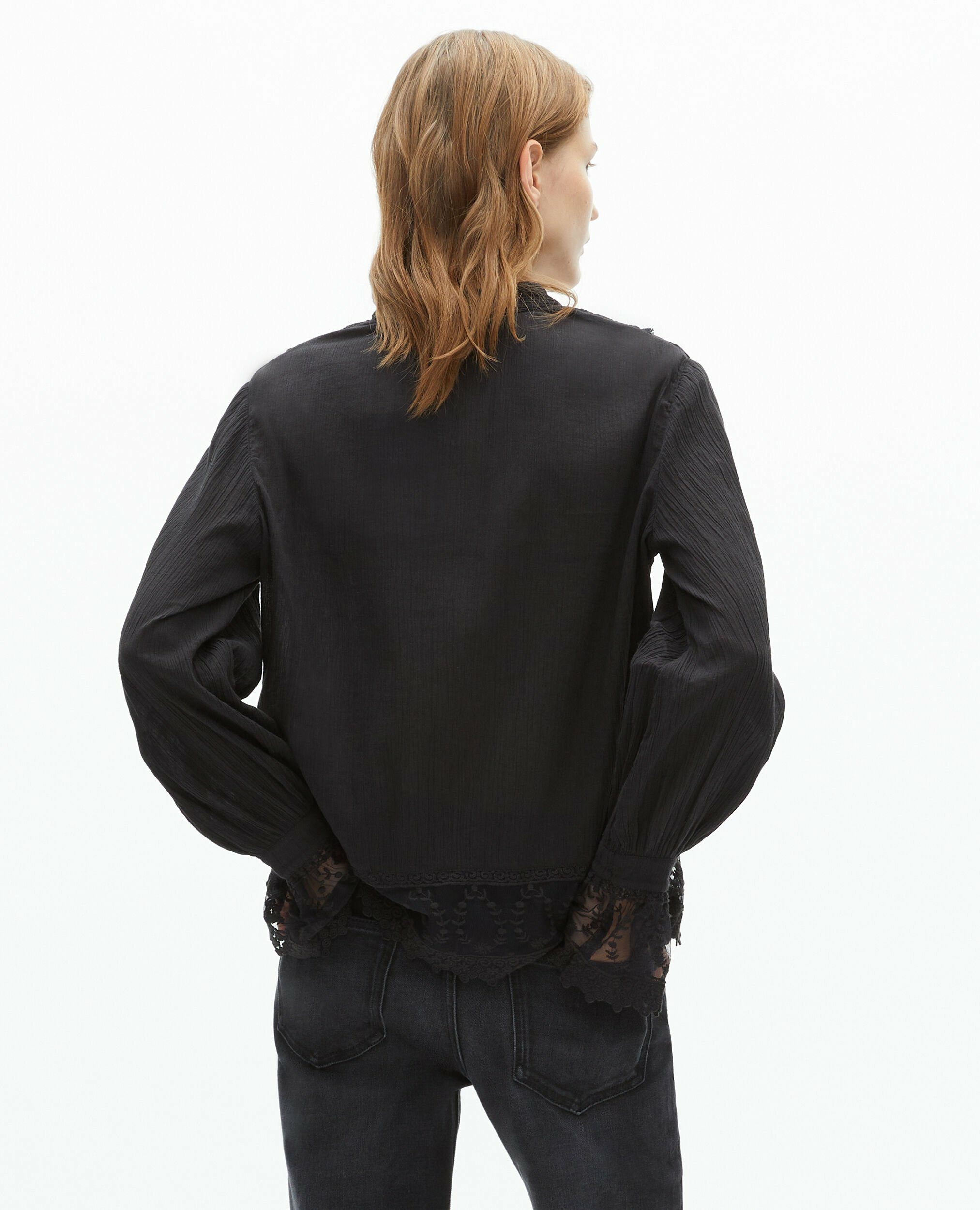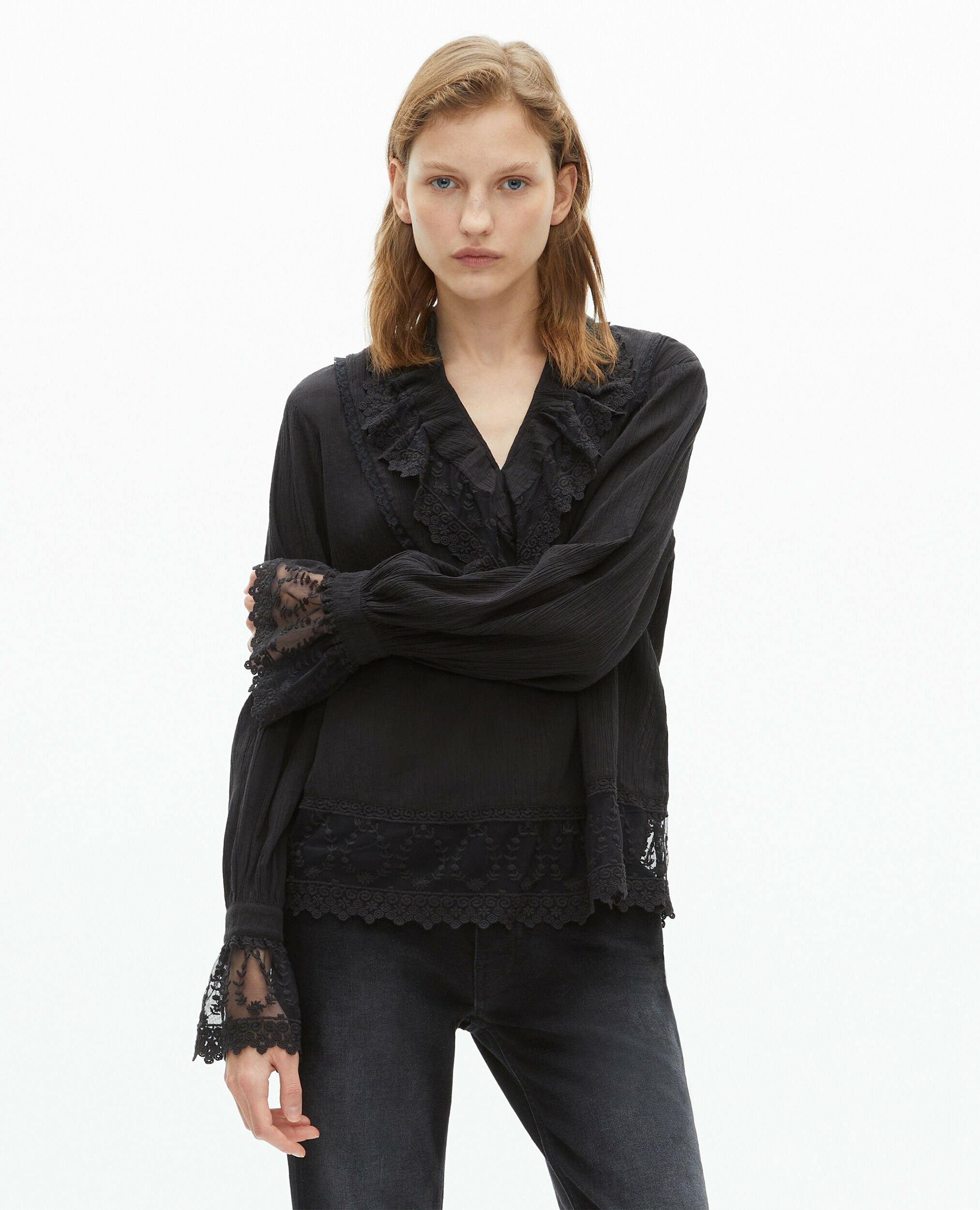 Composé en coton crinkle, ce top se distingue par ses manches longues, son col en V, ses détails de volants et ses empiècements en guipure. La coupe droite et large assure un tombé impeccable. Si vous hésitez entre deux tailles, optez pour la taille inférieure pour un ajustement optimal.