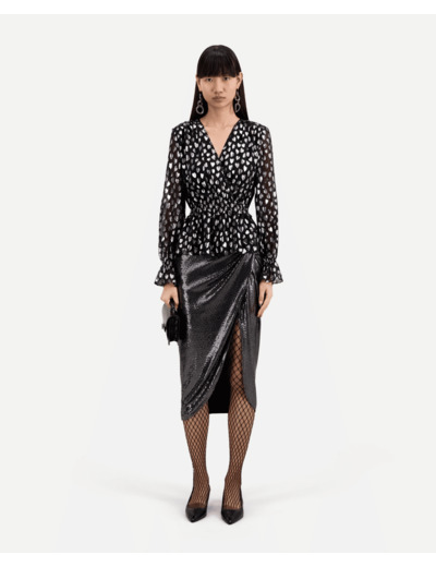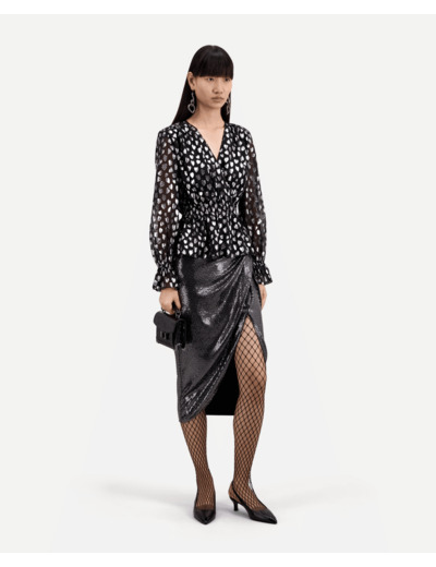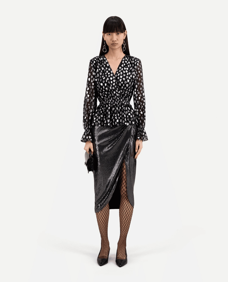 Confectionné dans un mélange de viscose et de fibres métalliques, ce top allie confort et éclat subtil grâce à son motif cœur en fil coupé argenté. Les manches longues aux poignets élastiqués et volantés ajoutent du mouvement, tandis que la taille smockée souligne délicatement la taille pour une allure ajustée et flatteuse.