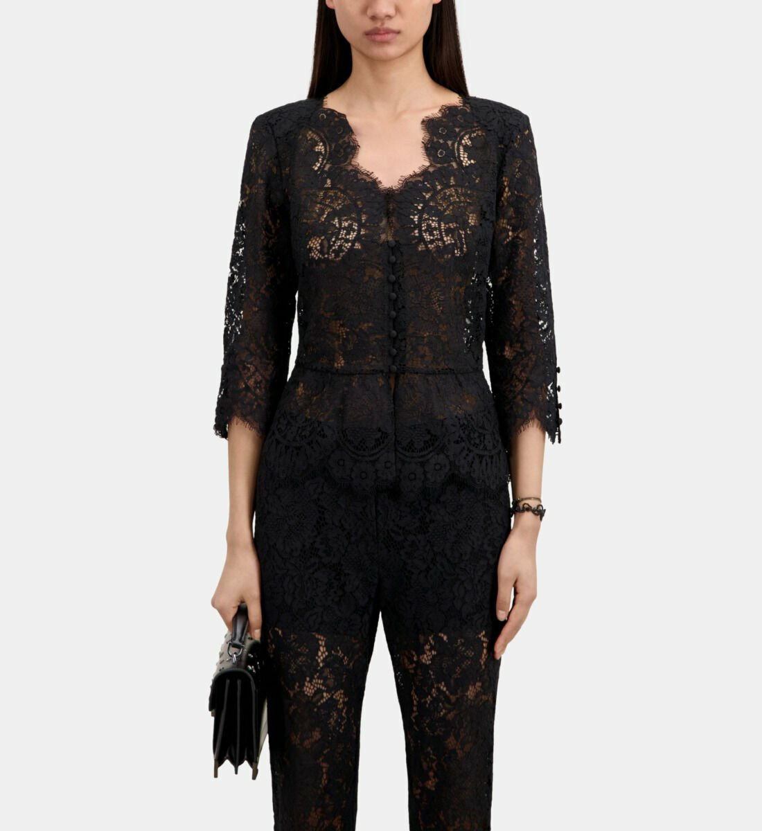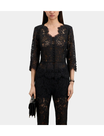 Conçu pour sublimer le décolleté, ce top dévoile un cœur délicatement souligné par un boutonnage devant qui apporte une touche sophistiquée. Les manches longues finies par des poignets à boutons et les bords festonnés ajoutent une dimension féminine et travaillée, parfaite pour une allure chic en toutes occasions.