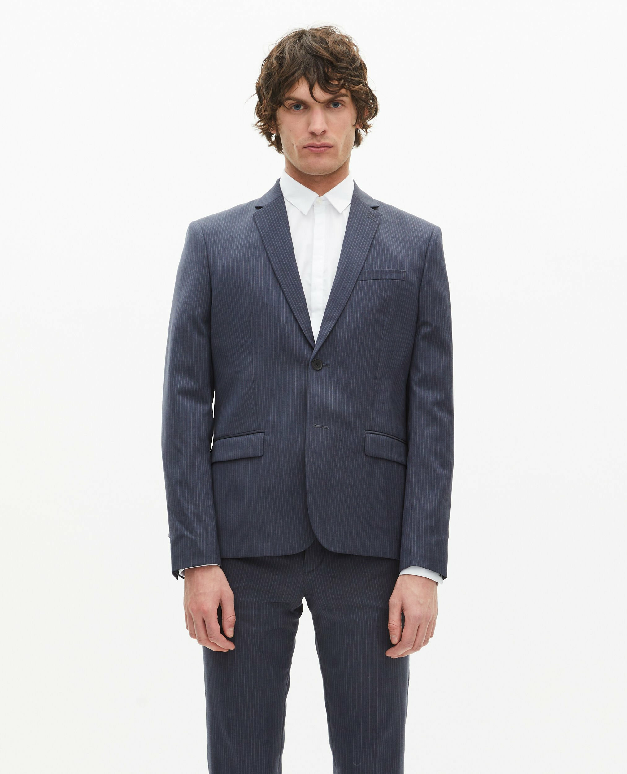 La veste présente une coupe ajustée avec col cranté, manches longues, fermeture deux boutons, boutons en corne aux poignets, poches passepoilées et à rabat, ainsi que deux fentes au dos. Le tissu est en laine italienne de haute qualité. Pour un look coordonné, associez-la au pantalon référence HPAN30001KBLU01.