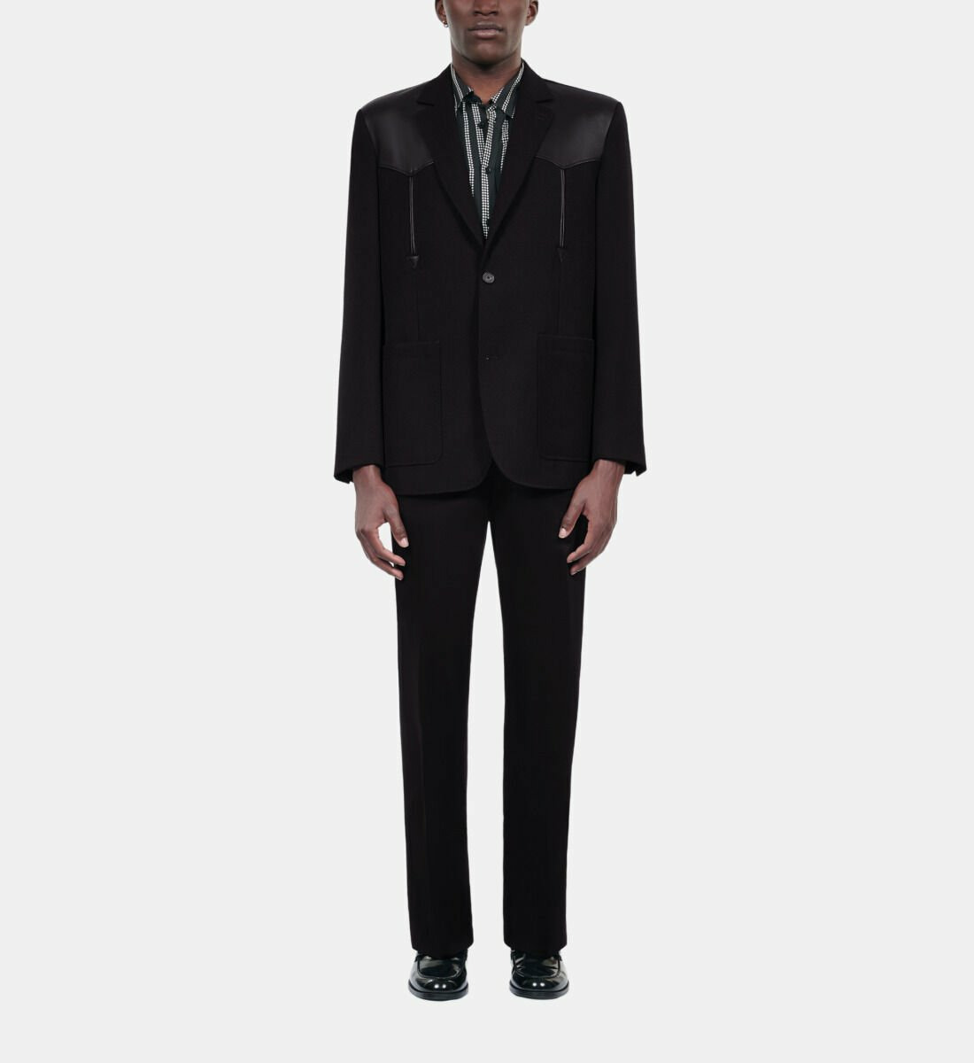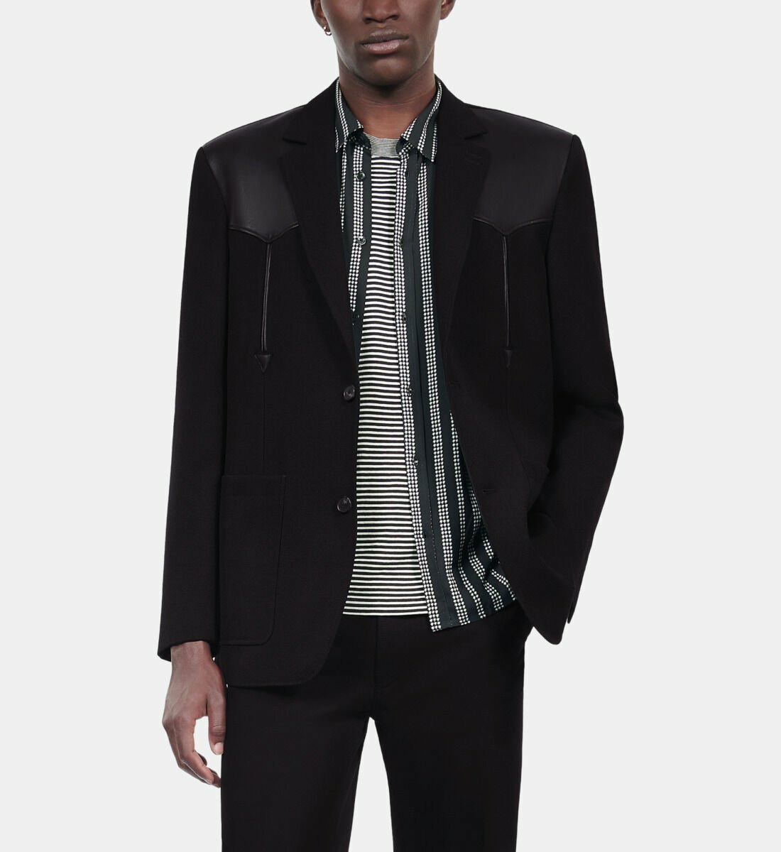 Confectionnée dans un tissu italien d’exception, cette veste droite séduit par son col cranté et ses manches longues finies par des boutons aux poignets. La fermeture à deux boutons souligne une silhouette épurée, tandis que les poches plaquées et passepoilées apportent une touche fonctionnelle et raffinée. Les empiècements en cuir d’agneau ajoutent une dimension luxueuse et tactile, rehaussant ce classique revisité.