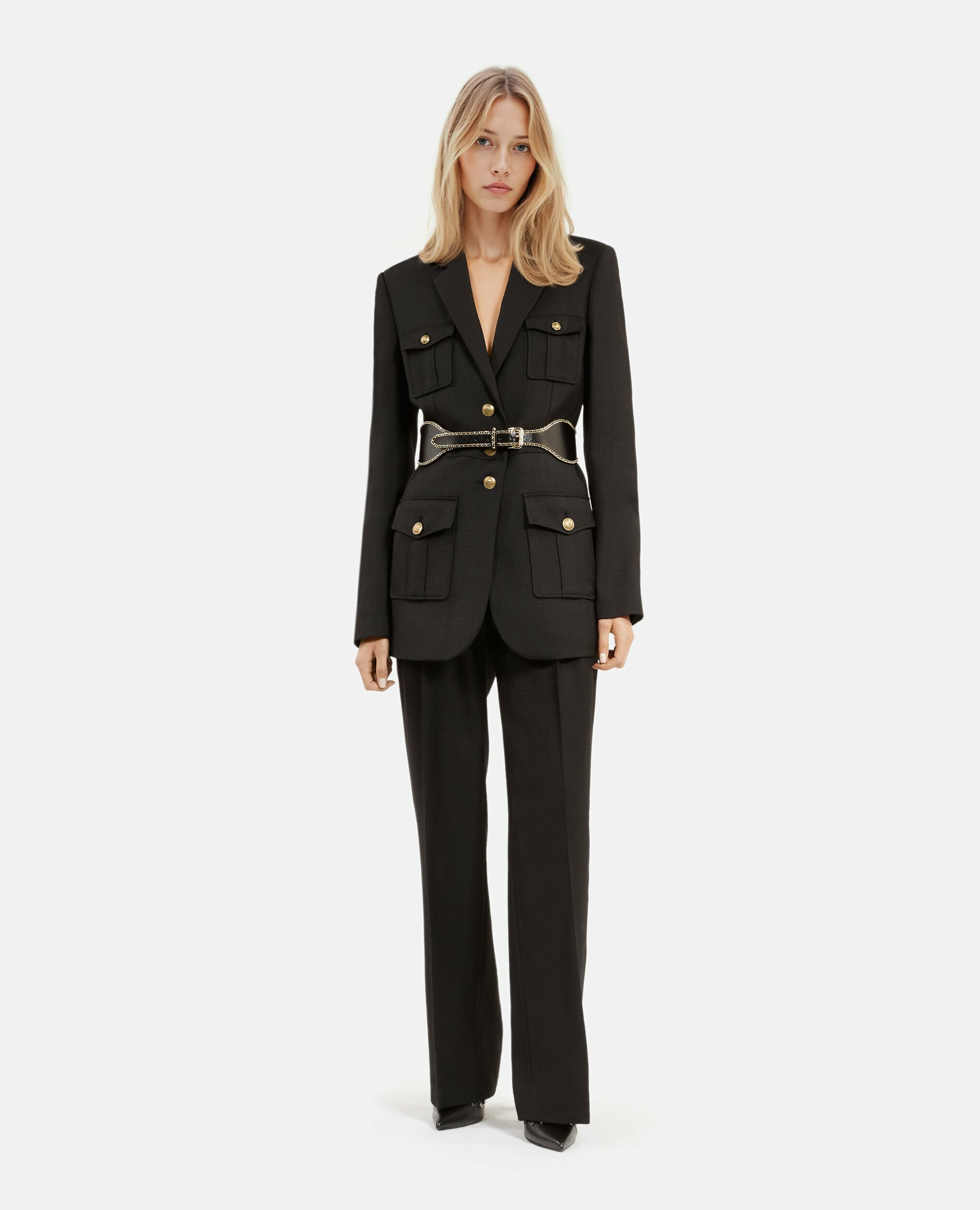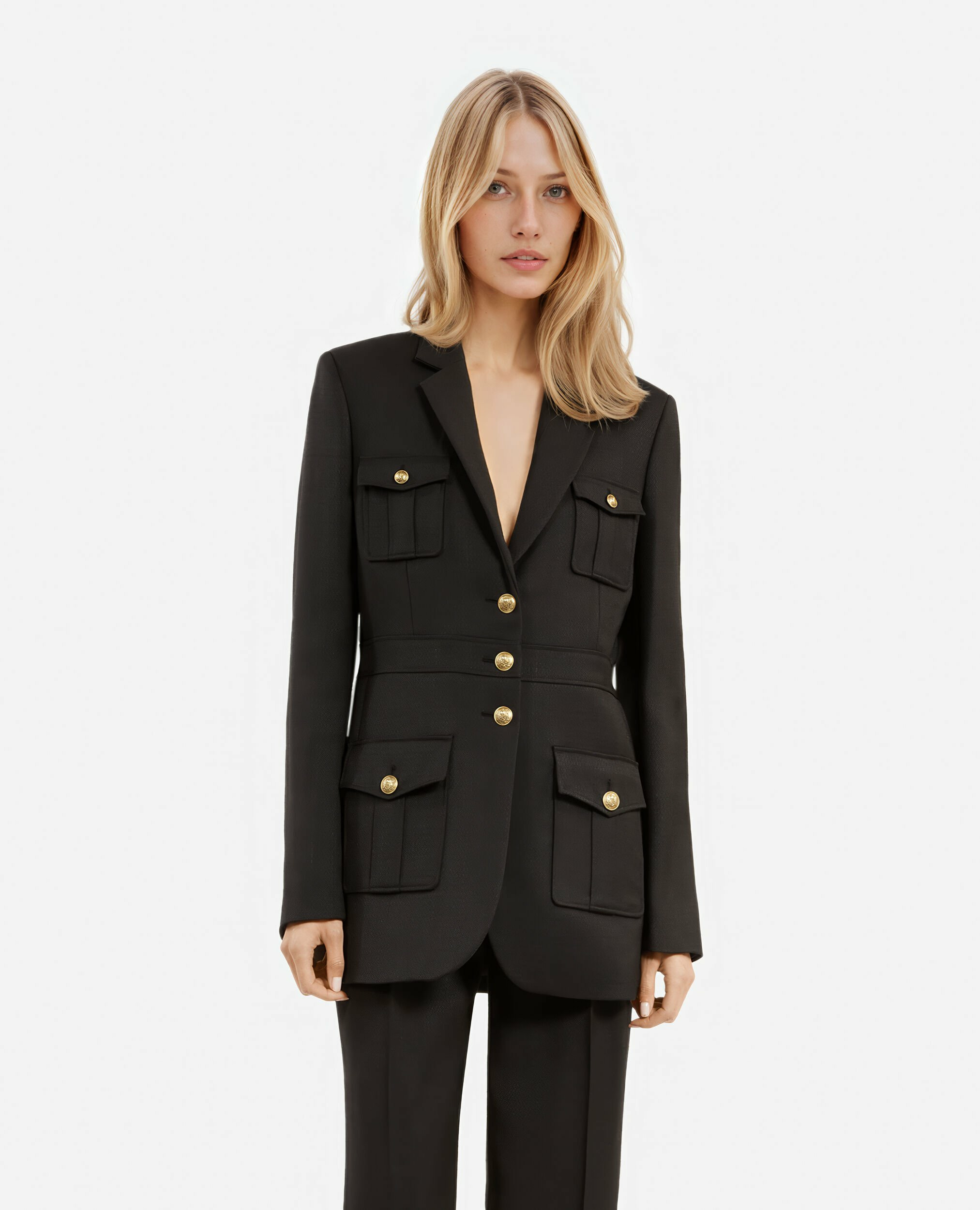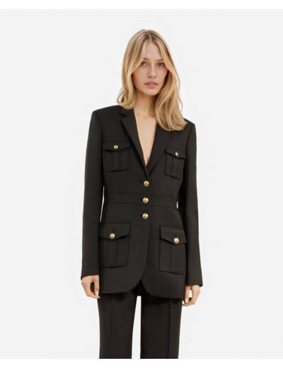 Fabriquée par The Kooples, cette veste est dotée d’une fermeture trois boutons, de manches longues avec boutons aux poignets, et de quatre poches plaquées à rabat. Sa coupe droite et ajustée assure une silhouette élégante et contemporaine.