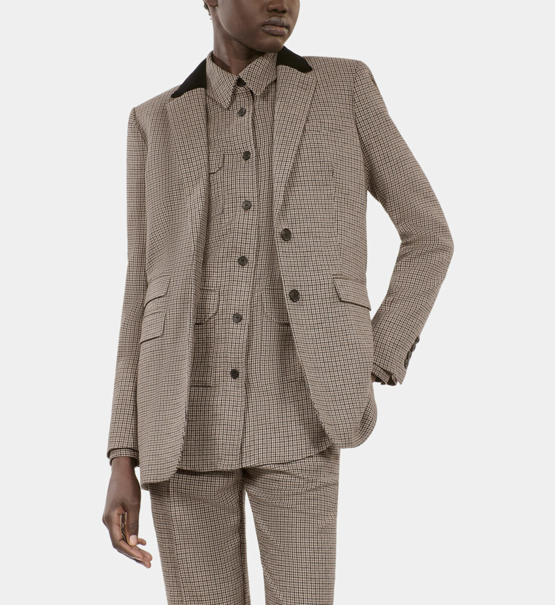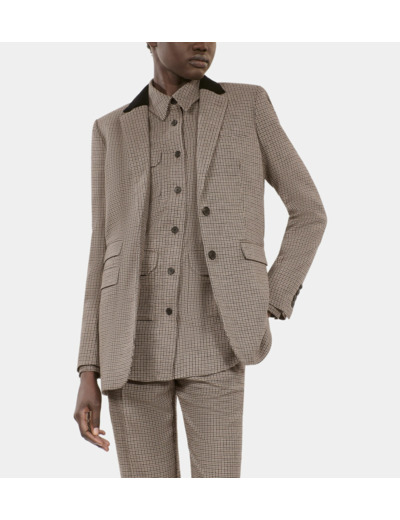 Conçue pour sublimer la silhouette féminine, cette veste costume épouse parfaitement les formes grâce à une coupe ajustée. Son coloris beige doux s’adapte aisément à un dressing varié, du bureau aux sorties en ville, offrant polyvalence et raffinement. La texture pied de poule ajoute du caractère sans sacrifier la sobriété.