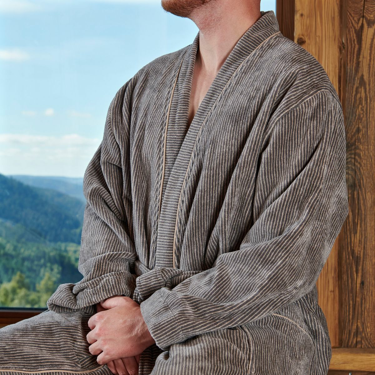 Son motif à fines rayures apporte une touche masculine et sophistiquée, parfaite pour la détente après le bain.