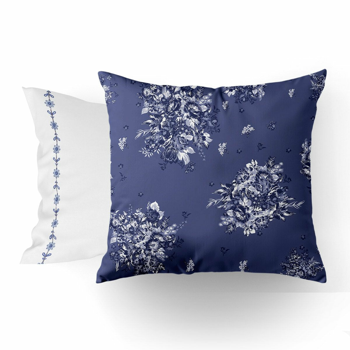 Une face dévoile de délicats bouquets fleuris dans des nuances de bleu, tandis que l’autre, plus sobre, est animée de petits motifs discrets. Cette dualité permet de changer d’ambiance au gré de vos envies, tout en conservant une allure chic et intemporelle.