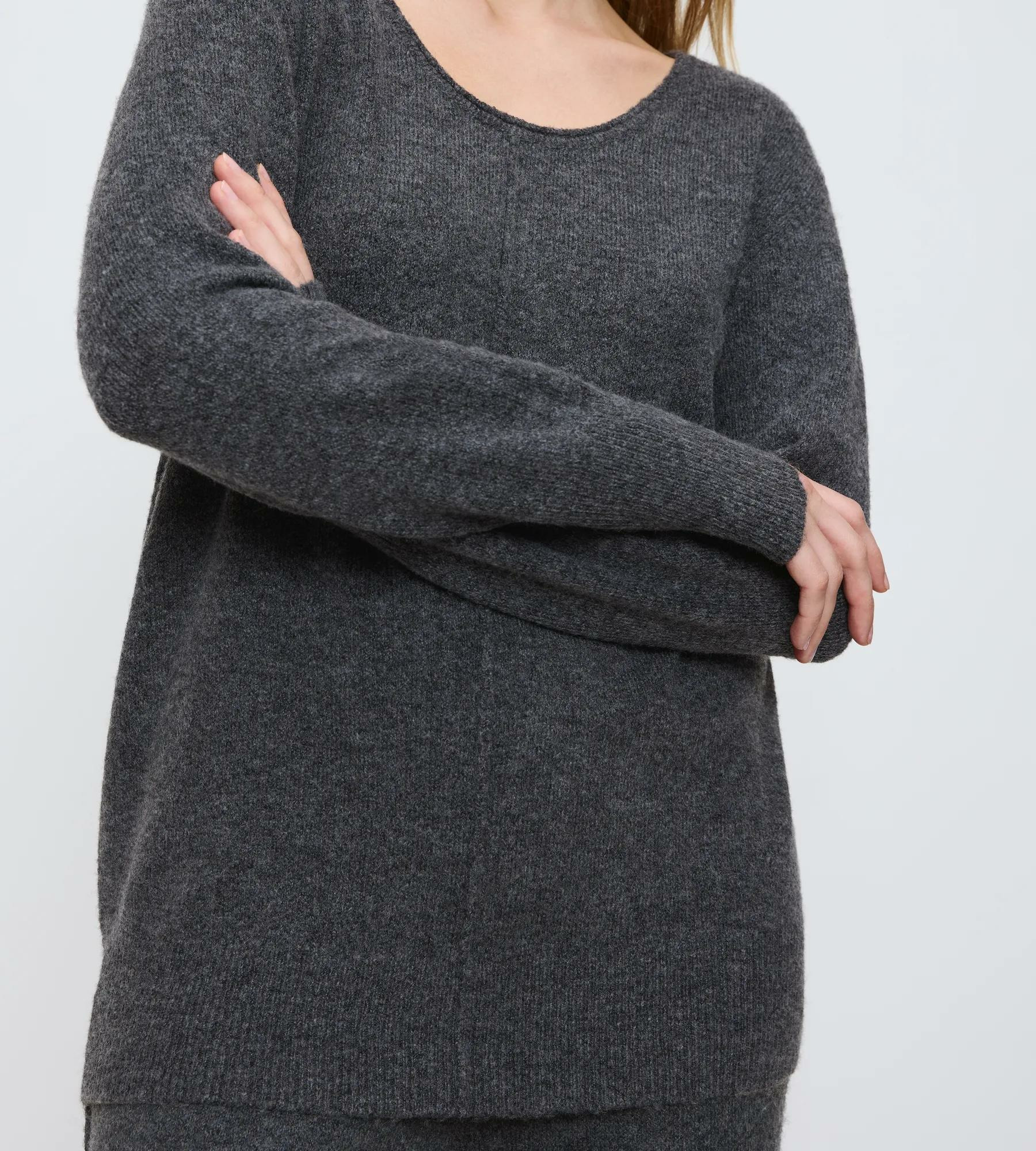 This long-sleeve, round-neck top is a versatile piece perfect for layering or wearing alone. Its relaxed fit, dropped shoulders, decorative central seam, and ribbed hems, give it a contemporary feel. Crafted from a soft, warm, fully fashioned knit made from 55% recycled polyester, this style is GRS certified.