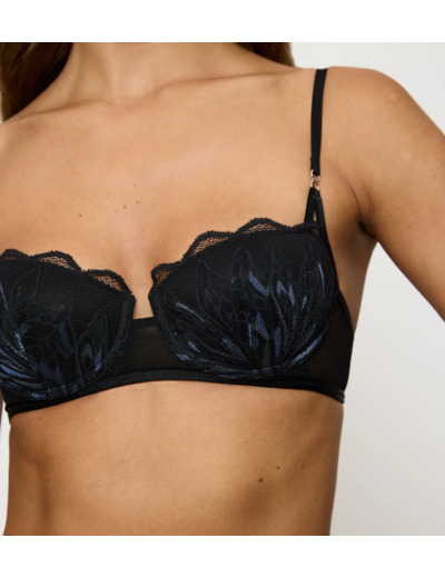 This wired, half-padded bra offers a charming look with a seductive balconette shape. The fancy dotted mesh on the wings, Italian lace on the cups, and seductive straps create a "WOW" effect. Comfort is not forgotten thanks to the feather-soft light cups and flexible wire.