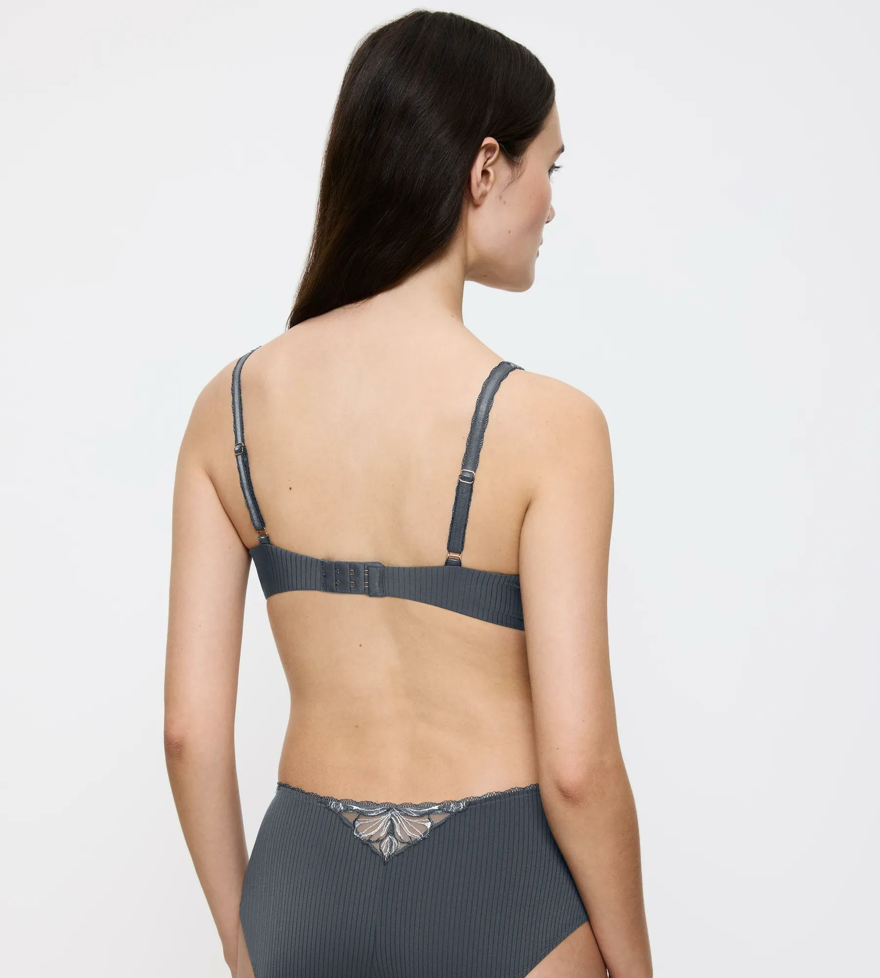 This non-wired, non-padded bra offers a feminine yet comfortable option to women. The floral embroidery coupled with pinstripe jacquard will elevate the silhouette. It also offers lightness thanks to its centre-front keyhole and seamlessly blended shoulder straps.
