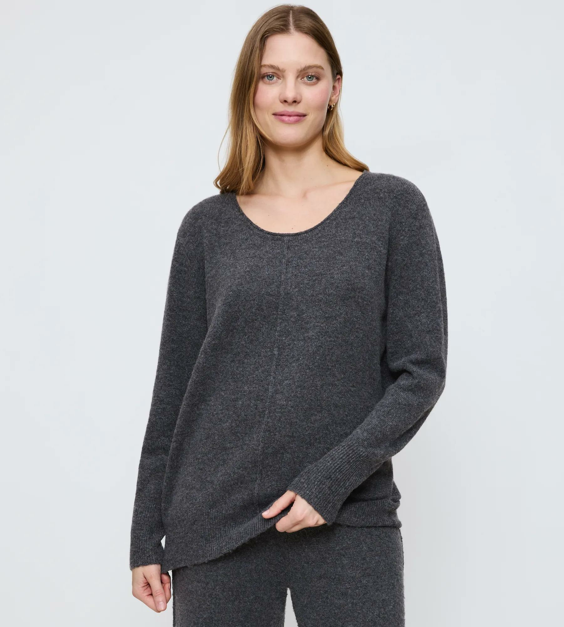 This long-sleeve, round-neck top is a versatile piece perfect for layering or wearing alone. Its relaxed fit, dropped shoulders, decorative central seam, and ribbed hems, give it a contemporary feel. Crafted from a soft, warm, fully fashioned knit made from 55% recycled polyester, this style is GRS certified.