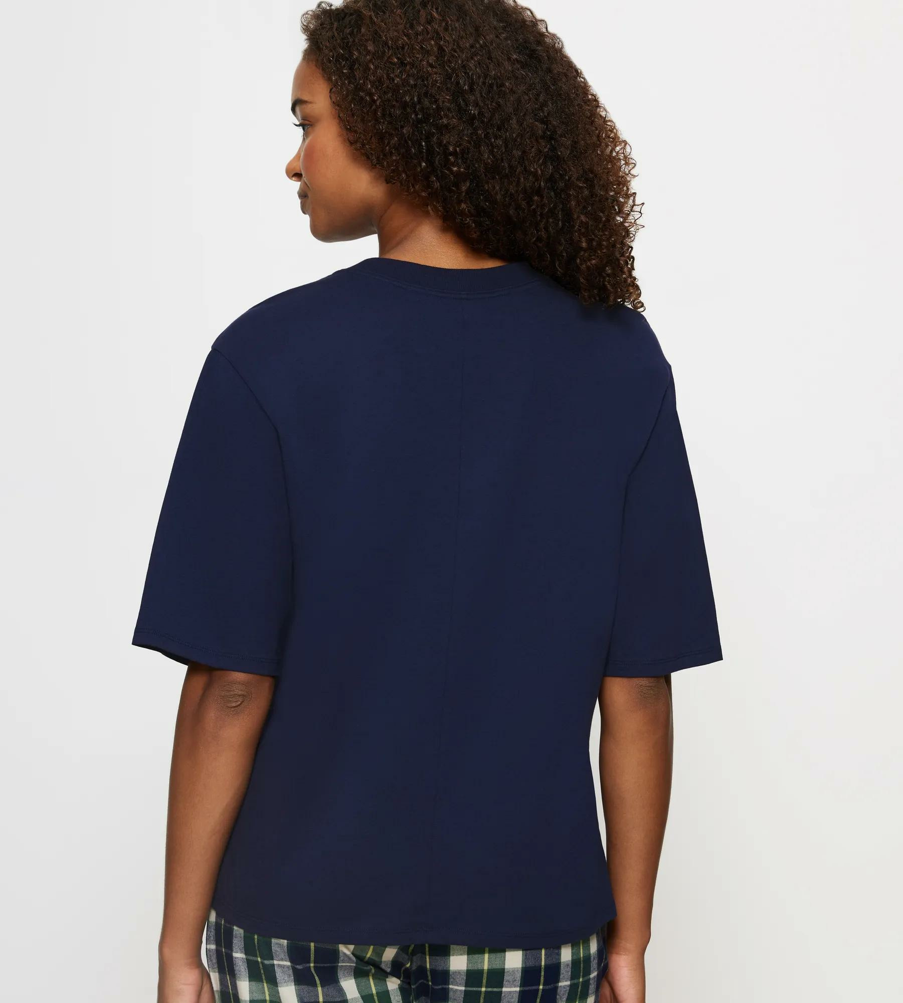 This top, featuring 3/4 sleeves, is a versatile essential suitable for any season. Its rib crew neck and relaxed boxy shape, bring a contemporary flair to this everyday piece. Crafted from 100% breathable GOTS certified organic cotton, this top ensures your comfort transitions from night to morning.
