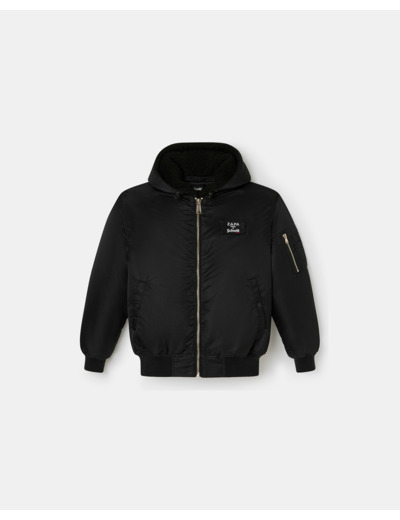 Coupe oversize, fermeture zippée, capuche doublée en fausse peau lainée amovible, finition bord côte aux poignets et à la taille, poches raglans, logo scratch amovible, coloris noir.