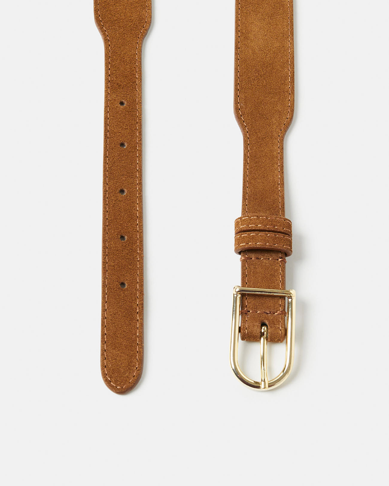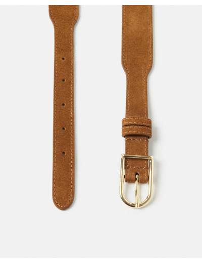 Ceinture large en cuir de veau suédé 100%, coloris cognac, boucle dorée. Entretien : lavage interdit, blanchiment interdit, séchage interdit, repassage interdit, nettoyage modéré recommandé.