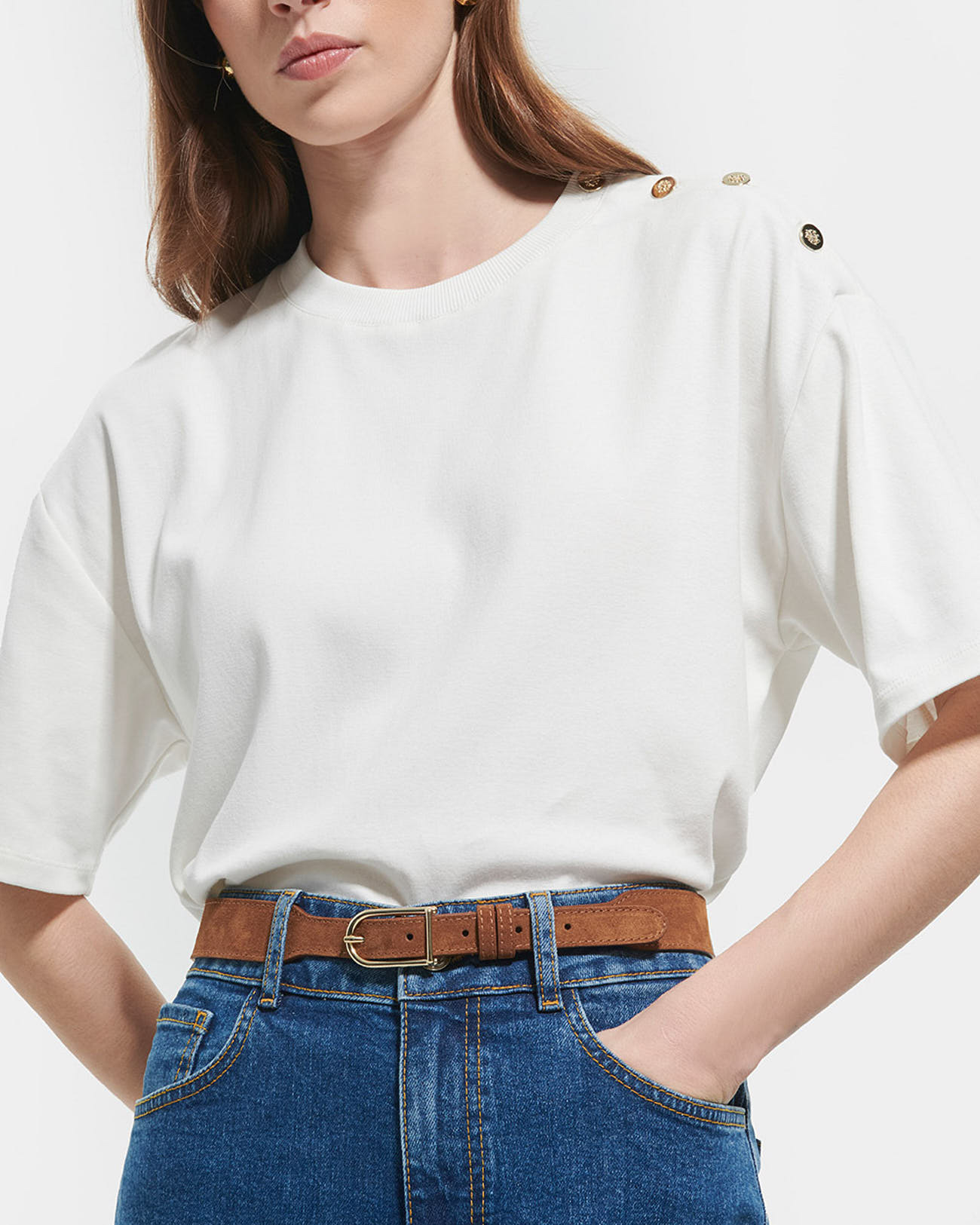 Conçue pour durer, cette ceinture large en cuir suédé offre une texture douce et raffinée qui capte la lumière subtilement. Sa boucle dorée classique souligne un style intemporel, idéal pour structurer vos looks avec une note chic et naturelle. Que ce soit pour un jean décontracté ou une tenue habillée, elle s’adapte avec aisance.