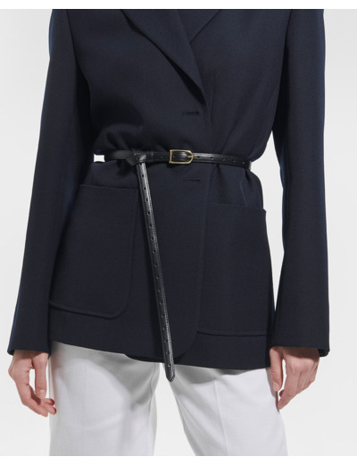 100% cuir de veau lisse, fabriquée en Italie. Ceinture fine avec boucle dorée. Coloris noir. Entretien : lavage, blanchiment, séchage et repassage interdits. Nettoyage modéré recommandé.