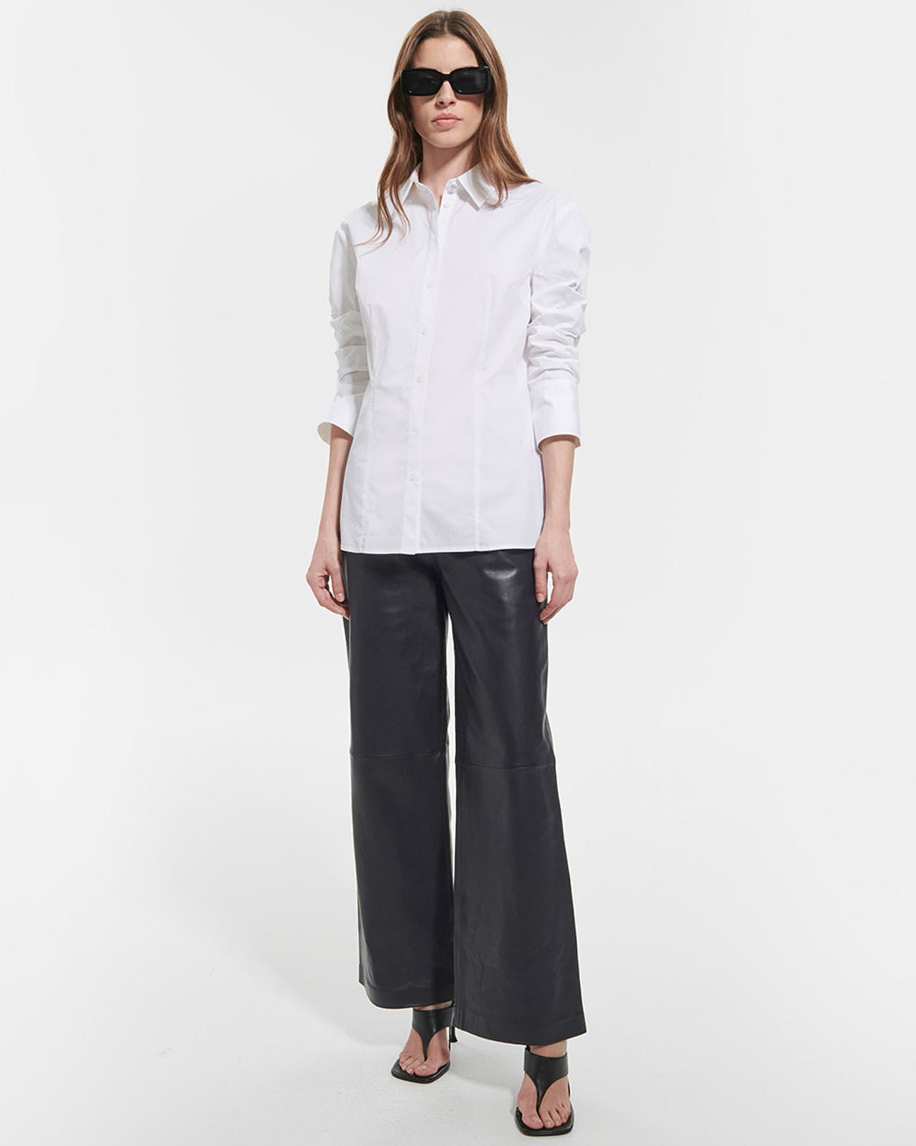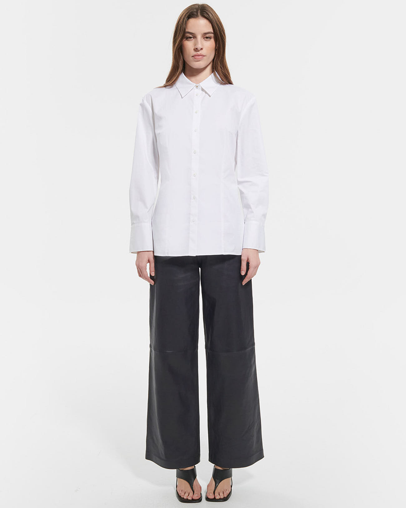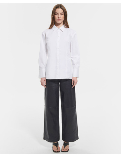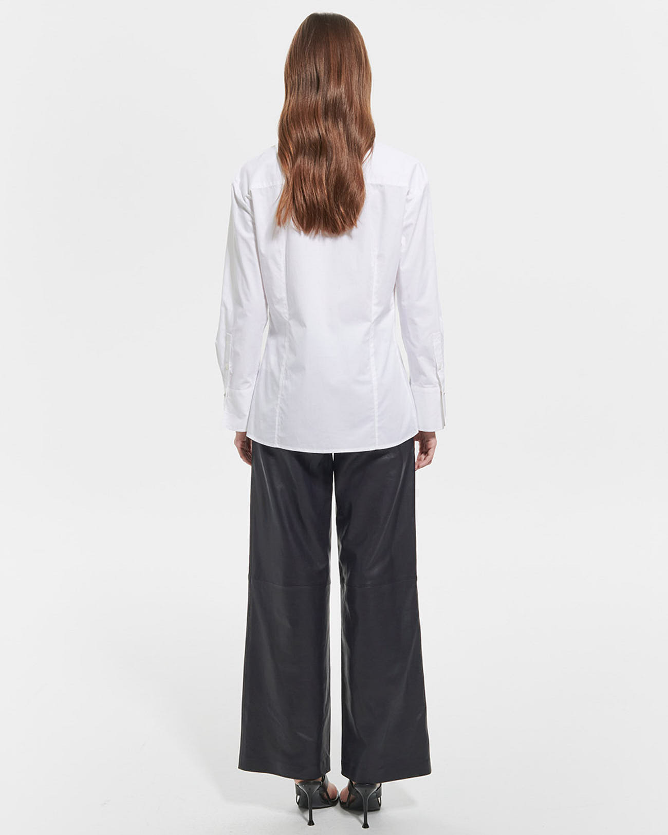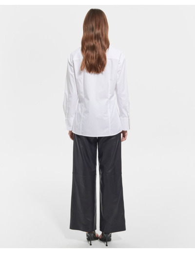 Chemise cintrée, fermeture boutonnée, col à revers, manches longues, coloris blanc. Composition 100% coton. Entretien : lavage interdit, blanchiment interdit, séchage interdit, repassage interdit, nettoyage modéré recommandé.