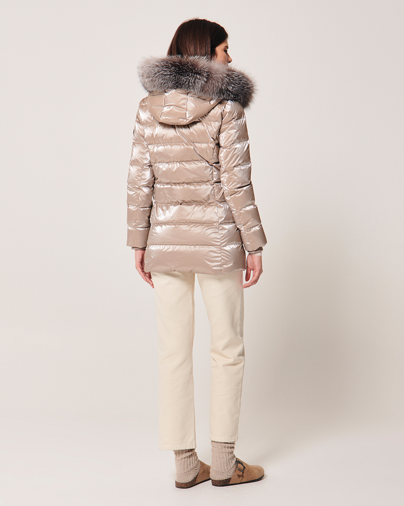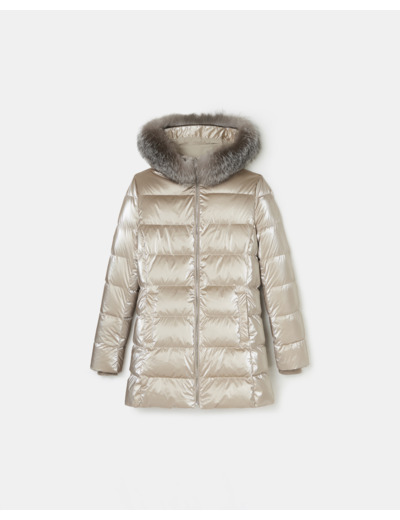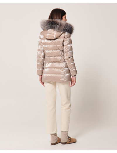 Doudoune mi-longue, longueur 79 cm. Composition 100% polyamide, rembourrage 90% duvet de canard, 10% plume de canard. Capuche avec fourrure véritable amovible. Col montant, fermeture zippée, poches raglan. Entretien : nettoyage à sec délicat uniquement, ne pas laver, blanchir, sécher en machine ni repasser.