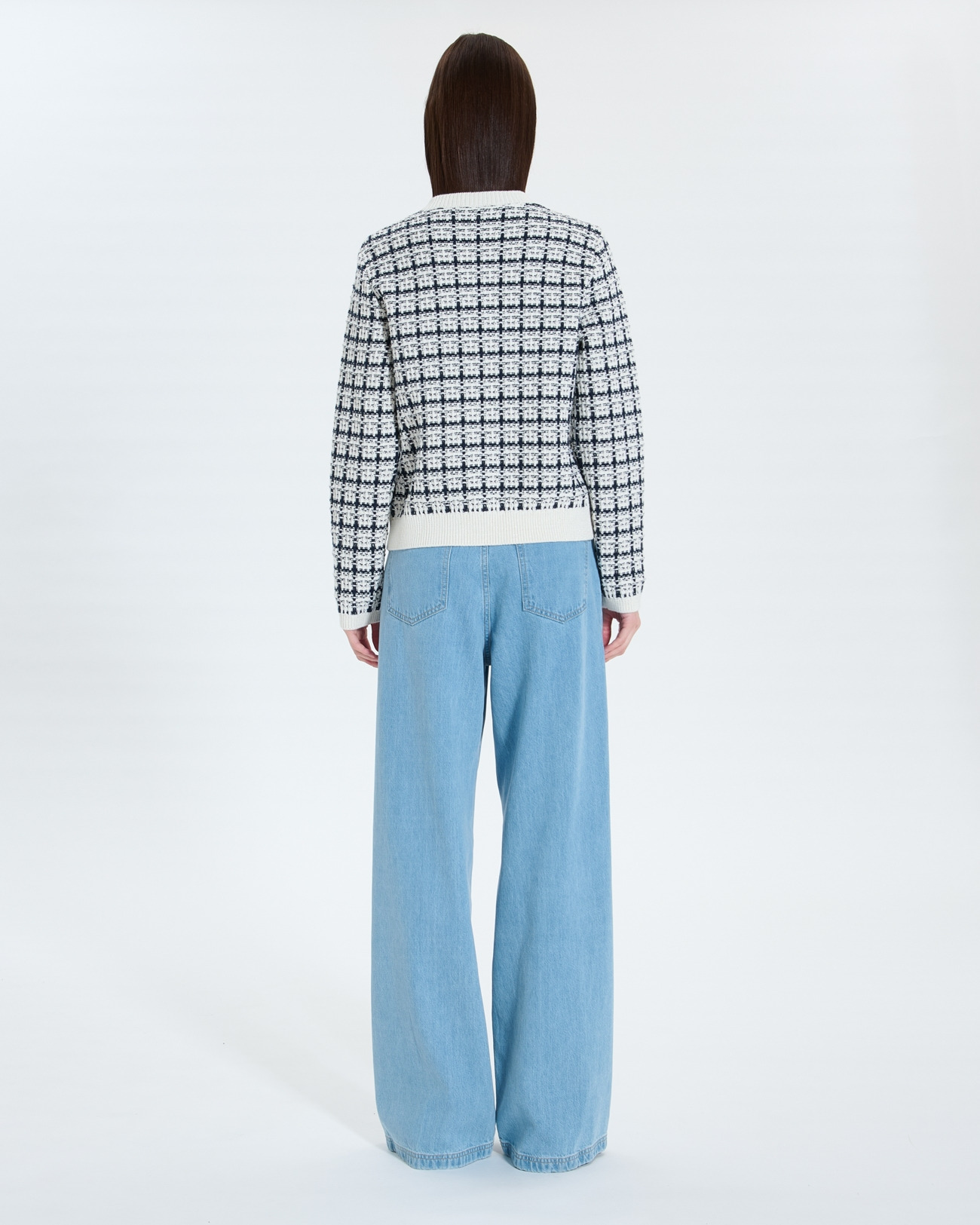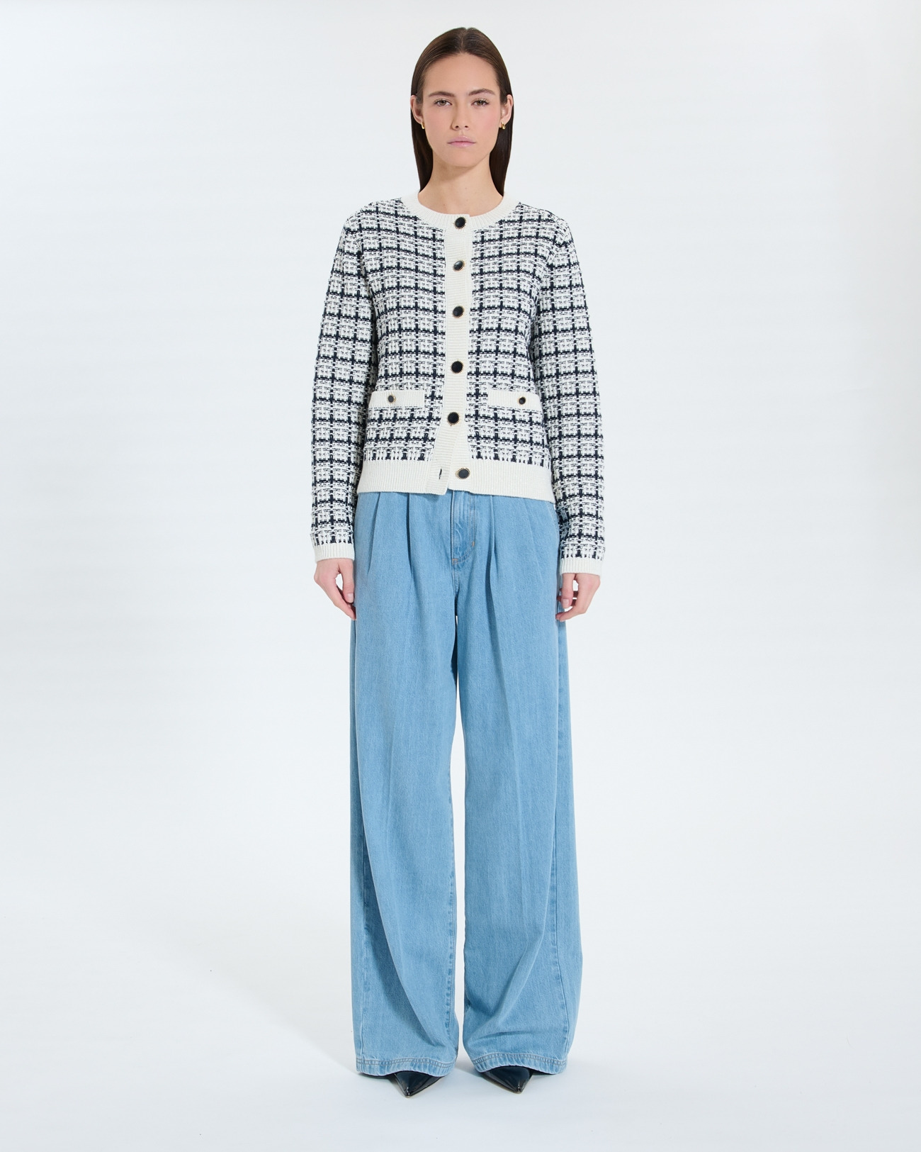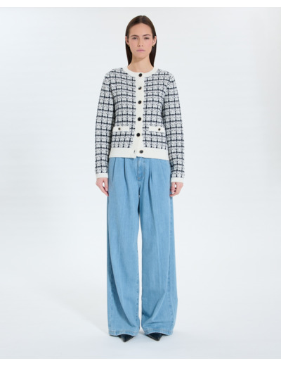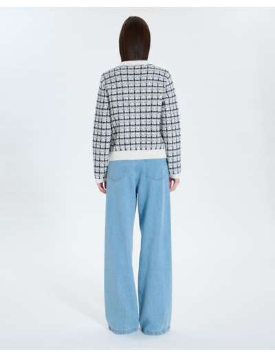 Confectionné en maille fine effet tweed, ce gilet se distingue par son jeu de couleurs nocturne et écru, souligné par des finitions dorées qui apportent une touche précieuse. Sa coupe ajustée et ses manches longues offrent une silhouette élégante, tandis que la fermeture boutonnée souligne son style classique revisité.