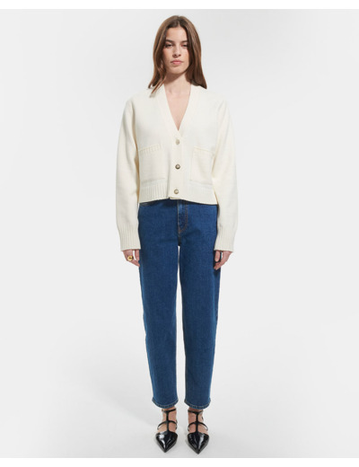 Composition : 55% laine, 45% coton. Entretien : lavage interdit, blanchiment interdit, séchage interdit, repassage interdit, nettoyage modéré recommandé. Manches longues, col V, fermeture boutonnée, coloris écru.