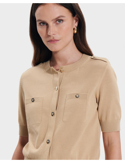 Le gilet Geoffrey se distingue par sa silhouette épurée et son col rond délicat, rehaussé d’une fermeture boutonnée dorée qui capte la lumière avec subtilité. Ses manches trois-quarts et ses deux poches plaquées à l’avant offrent un équilibre parfait entre confort et fonctionnalité, tandis que le coloris beige s’accorde aisément avec une palette variée de vêtements.