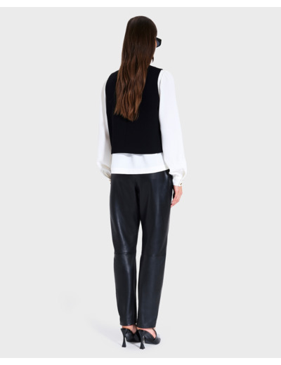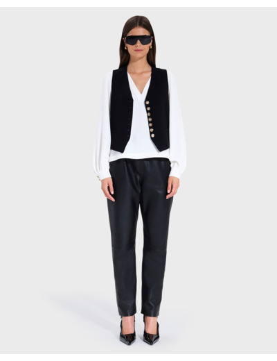 Conçu pour sublimer vos looks, ce gilet se porte aussi bien sur un chemisier léger que sur un pull fin. Sa coupe ajustée et son col V valorisent la silhouette tandis que la poche passepoilée ajoute un détail fonctionnel et esthétique. Associez-le au pantalon noir PHUKET pour un ensemble résolument contemporain et affirmé.