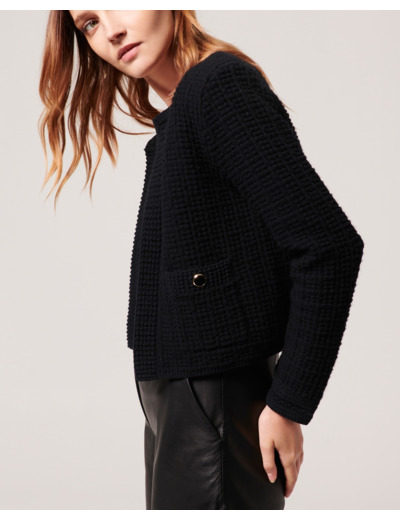 Réponse. Il s’agit d’un gilet court à col rond avec deux poches plaquées munies d’un bouton.