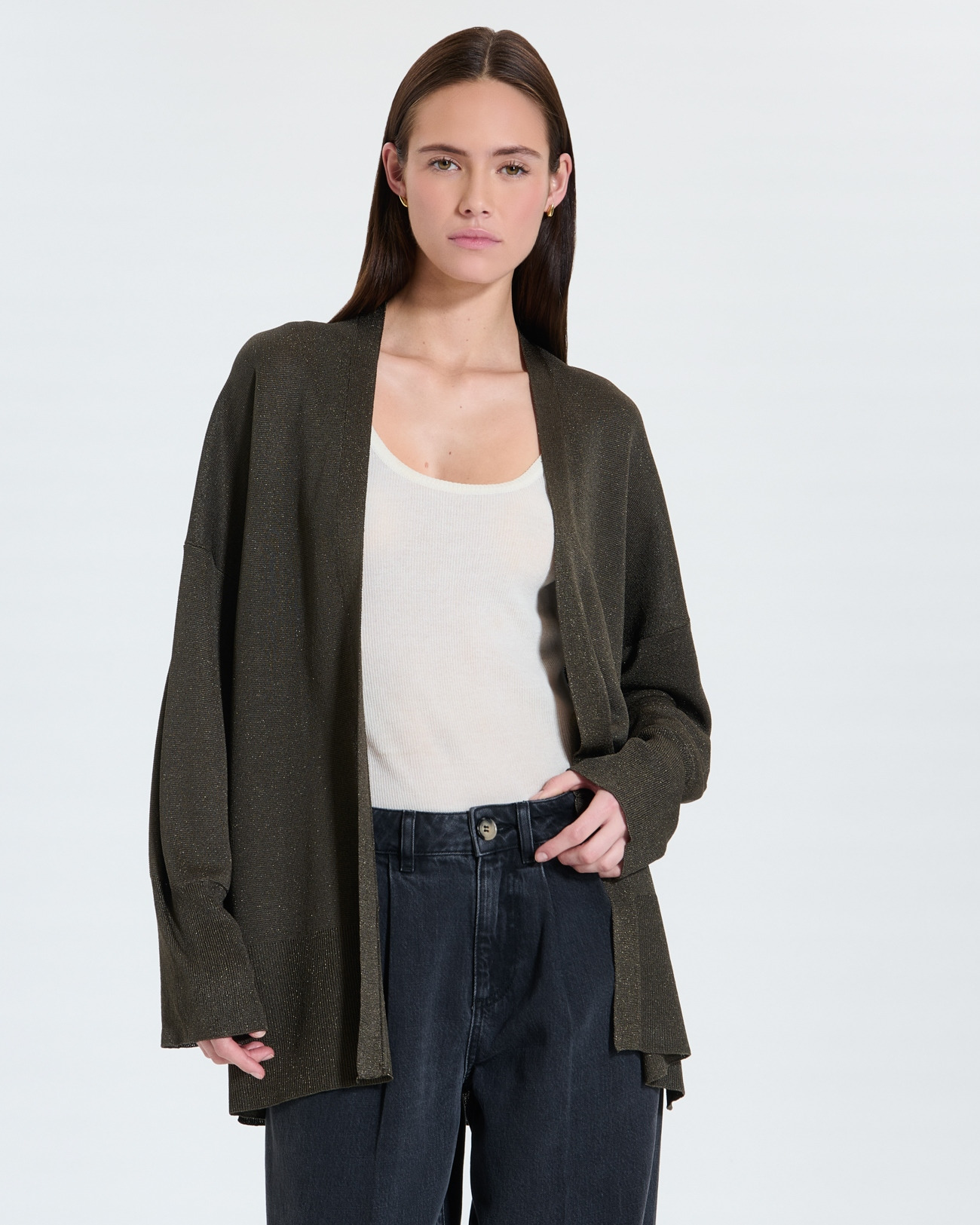 Sublimez votre allure avec ce gilet long kaki pailleté, alliant élégance et modernité. Sa silhouette fluide et son éclat subtil apportent une touche raffinée à toutes vos tenues.