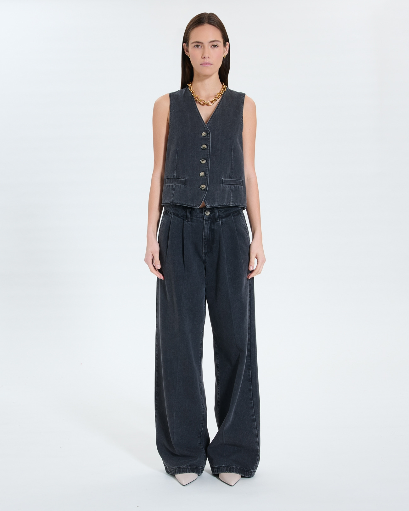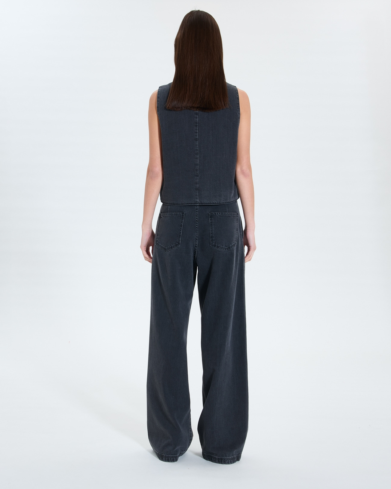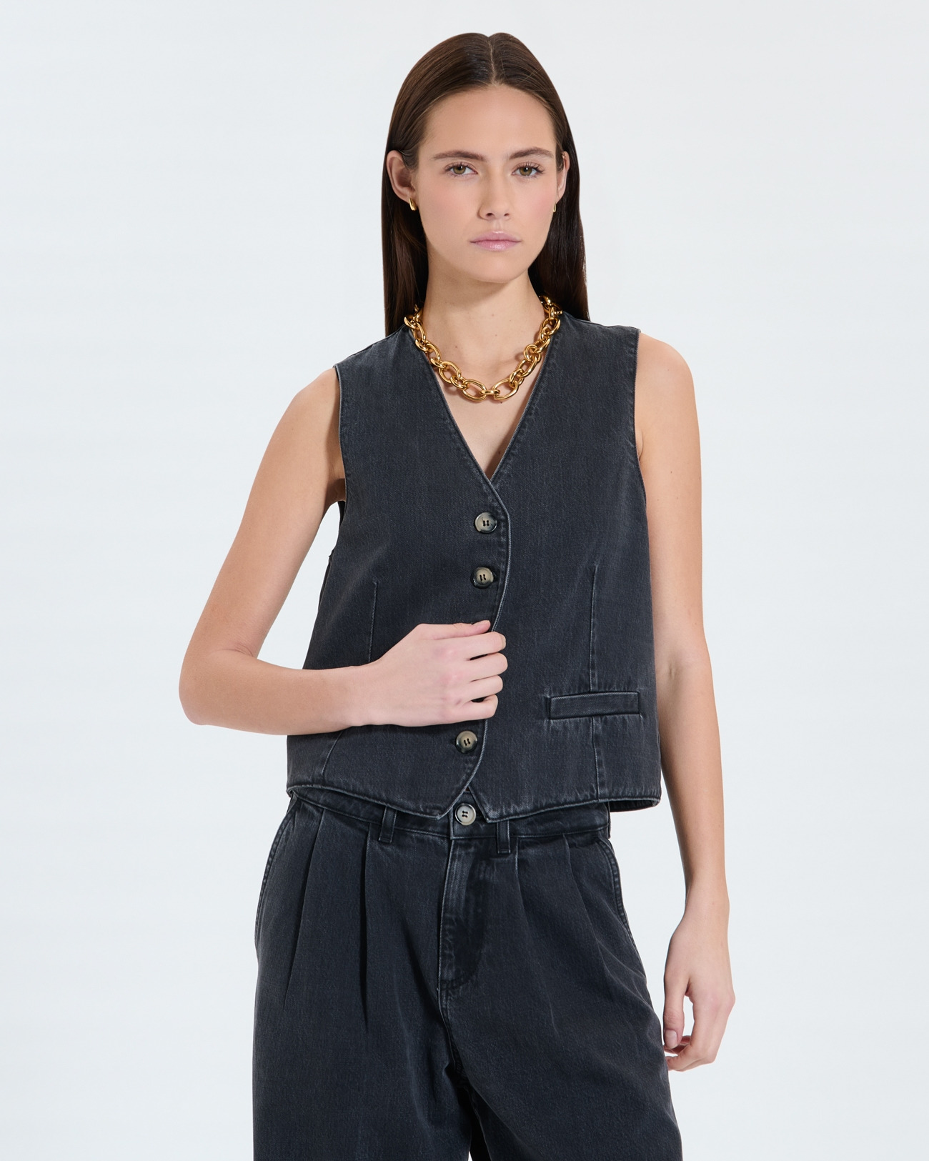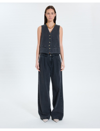 Affirmez votre style avec ce gilet sans manches en jean noir, une pièce incontournable pour un look à la fois moderne et audacieux. Sa coupe ajustée et son col V soulignent la silhouette avec élégance.