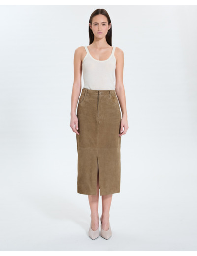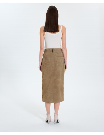 Jupe crayon en cuir de chèvre suédé 100%. Longueur midi de 79,5 cm avec fente sur le devant. Fermeture zippée au dos. Coloris chocolat. Entretien : lavage à la main recommandé, pas de blanchissage, ne pas sécher en machine, repassage doux à 110°C, nettoyage à sec possible.