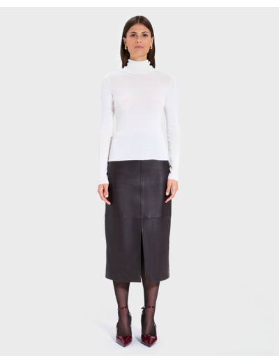 Conçue par les studios ZAPA, cette jupe crayon mi-longue épouse la silhouette avec finesse tout en offrant une allure moderne grâce à sa fente frontale subtile. Fabriquée en cuir d’agneau souple, elle allie confort et résistance pour un porté agréable au quotidien. Associez-la à la chemise en cuir CELINA pour un ensemble harmonieux et affirmé.