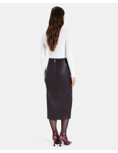 100% cuir d’agneau, longueur 79,5 cm, jupe crayon avec fente avant. Coloris chocolat. Entretien : ne pas laver, blanchir ou repasser. Séchage en tambour interdit. Nettoyage recommandé par un spécialiste du cuir.