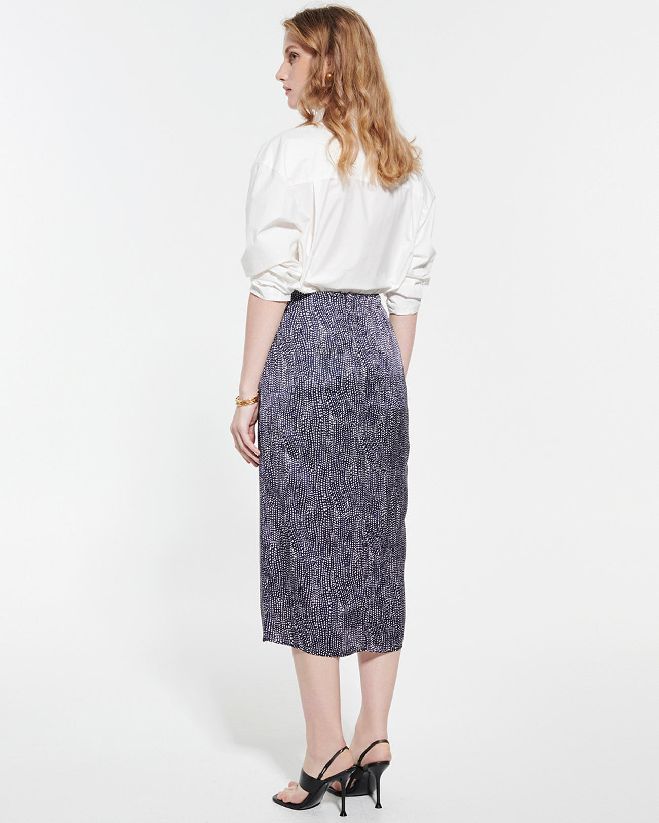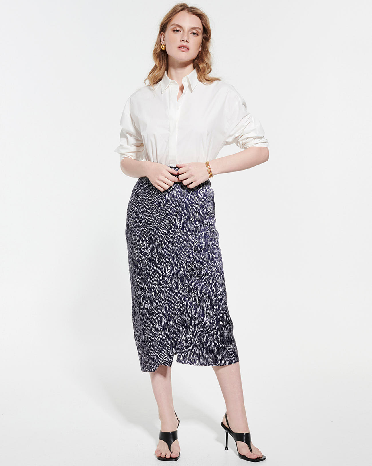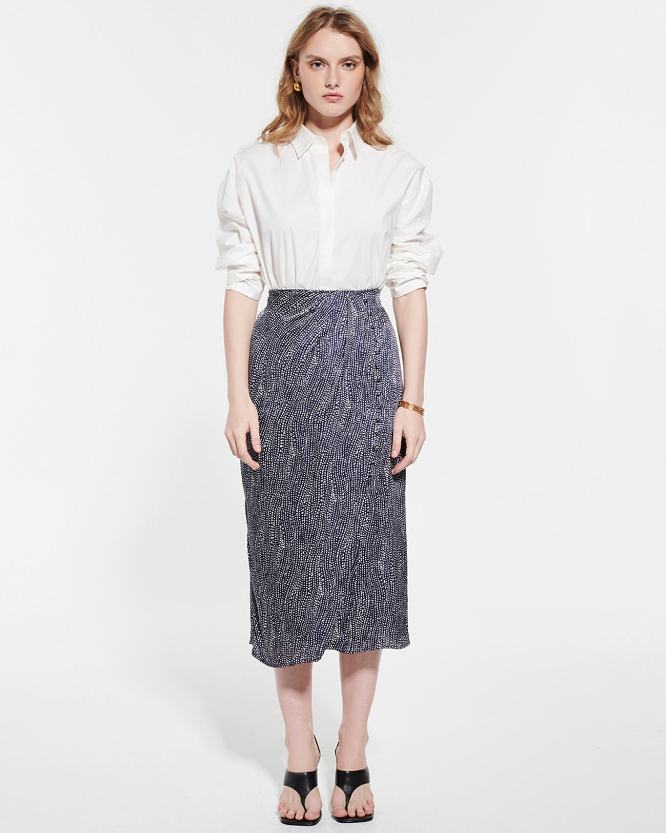Cette jupe midi à taille haute se distingue par sa coupe fluide qui épouse naturellement les formes, offrant un confort optimal et une allure gracieuse. Sa matière satinée légère capte la lumière avec subtilité, tandis que les boutons décoratifs à l’avant ajoutent un détail raffiné. Associez-la à la chemise CHACHA pour un total look pois parfaitement coordonné.