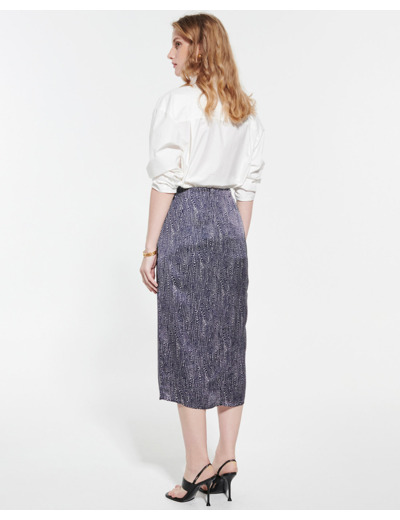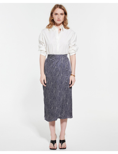 Composition 100% viscose, matière satinée douce et légère. Jupe midi longueur 80 cm, taille haute avec coupe fluide. Détails : boutons à l’avant, fermeture zippée au dos, imprimé marine et blanc, doublure polyester. Entretien : lavage interdit, blanchiment interdit, séchage interdit, repassage interdit, nettoyage modéré recommandé.
