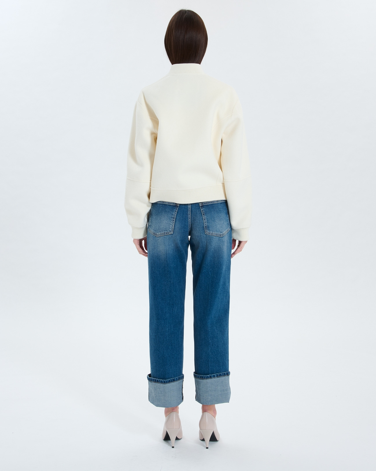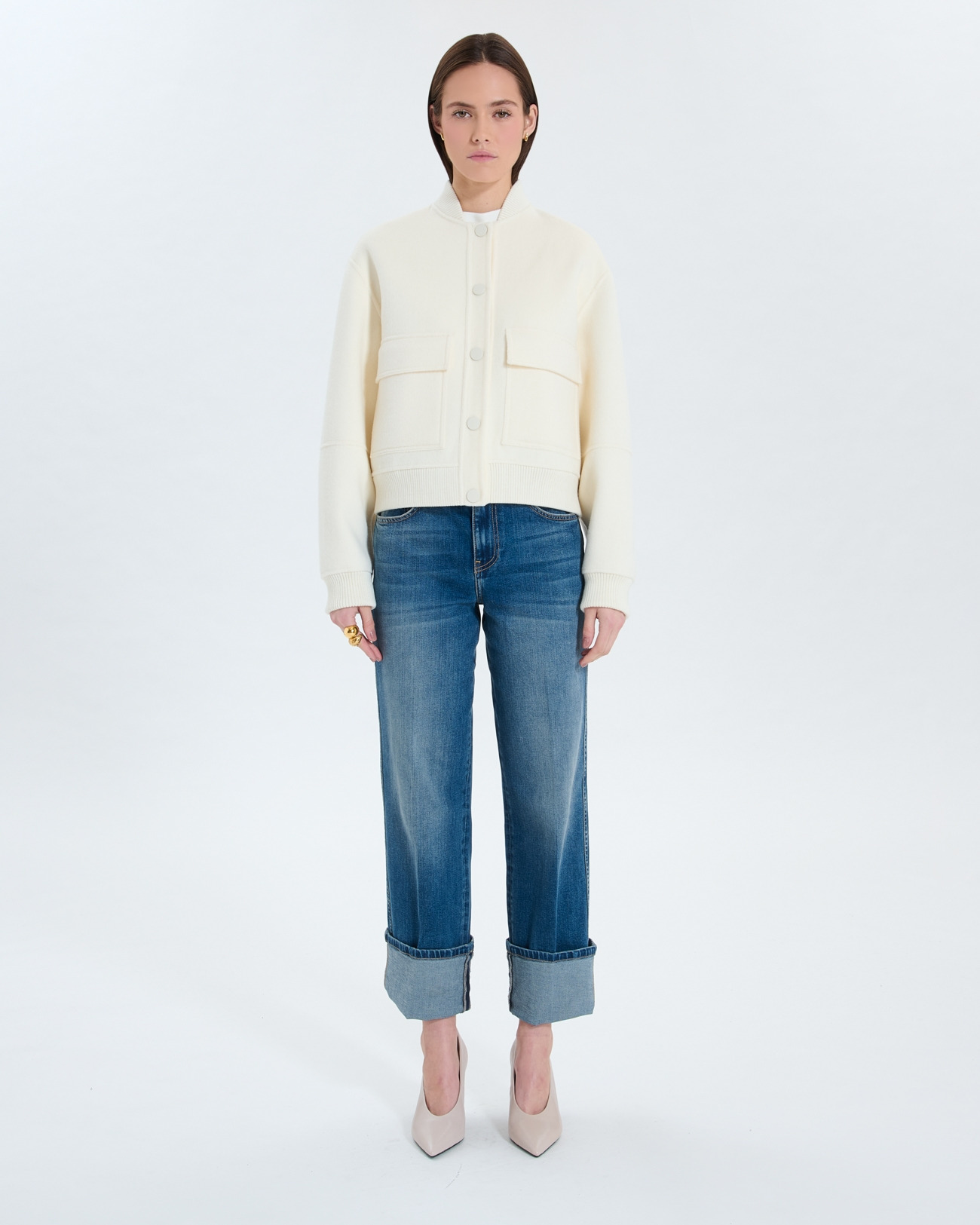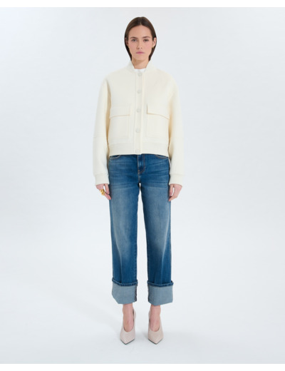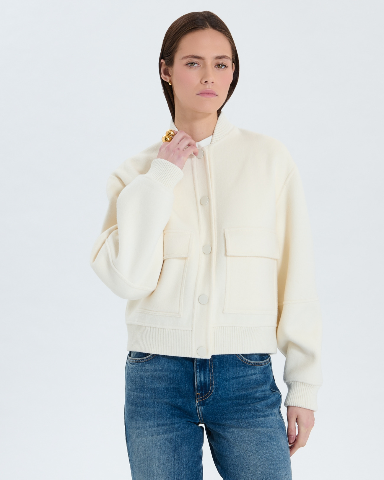 Composition : 80% laine, 20% polyamide. Entretien : lavage à la main conseillé, pas de blanchissage, ne pas sécher en machine, repassage doux à 110°C, nettoyage à sec possible. Coupe bomber, double face, fermeture par pressions, deux poches à rabats, coloris écru.