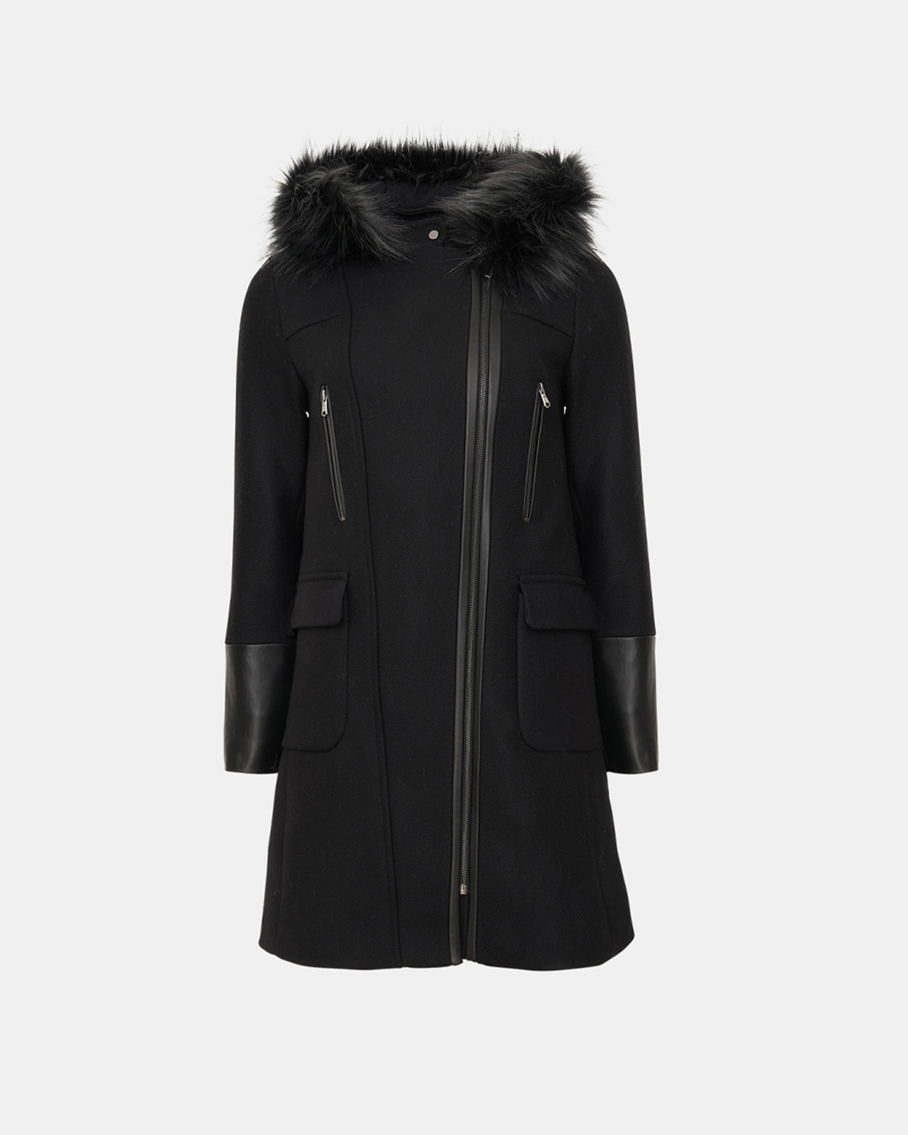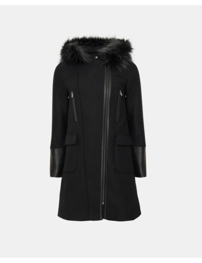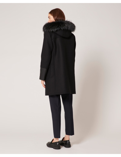 Composition : 75% laine, 25% polyamide, fourrure véritable de tanuki. Entretien : ne pas laver, pas de blanchissage, séchage en machine interdit, repassage doux à 110°C, nettoyage à sec recommandé. Coloris noir. Fermeture zippée, col pressionné en fourrure amovible, doublure matelassée.