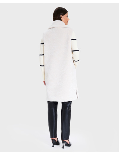 Adoptez l’élégance contemporaine avec le manteau Macaria écru, une pièce longue sans manches qui allie style et audace. Sa texture façon fourrure synthétique apporte une touche sophistiquée à toutes vos tenues.