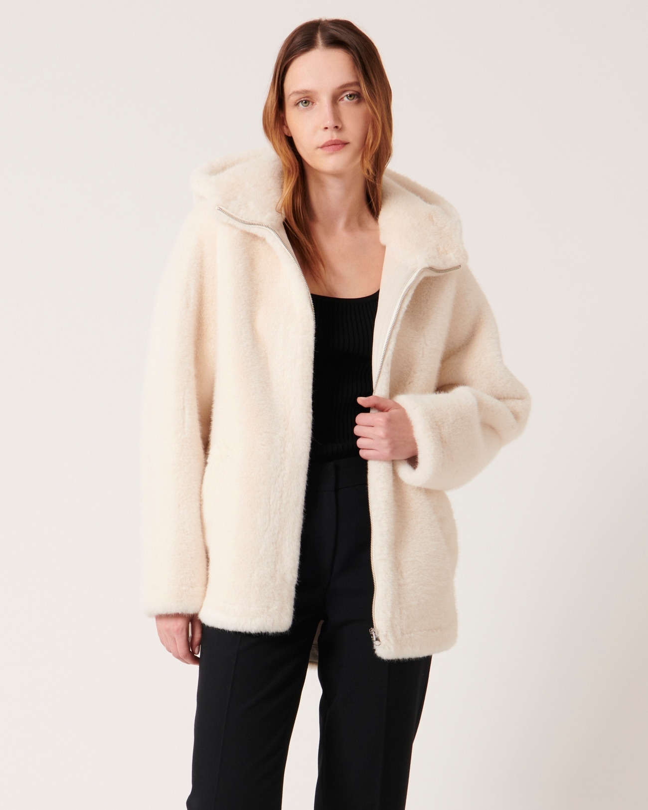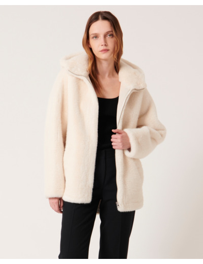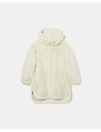 Manteau mi-long en fausse fourrure, coloris écru, longueur 85 cm. Capuche intégrée pour une protection renforcée. Fermeture zippée. Composition 100% polyester. Entretien : nettoyage à sec délicat uniquement, ne pas laver, blanchir, sécher en machine ni repasser.