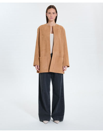 Composition : 100% cuir de chèvre suédé. Doublure : polyester. Entretien : lavage à la main, pas de blanchissage, ne pas sécher en machine, repassage doux à 110°C, nettoyage à sec recommandé. Coloris beige. Coupe droite, manches longues, deux poches plaquées. Longueur : 81 cm.