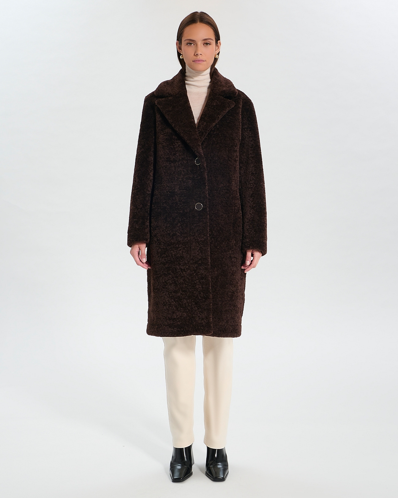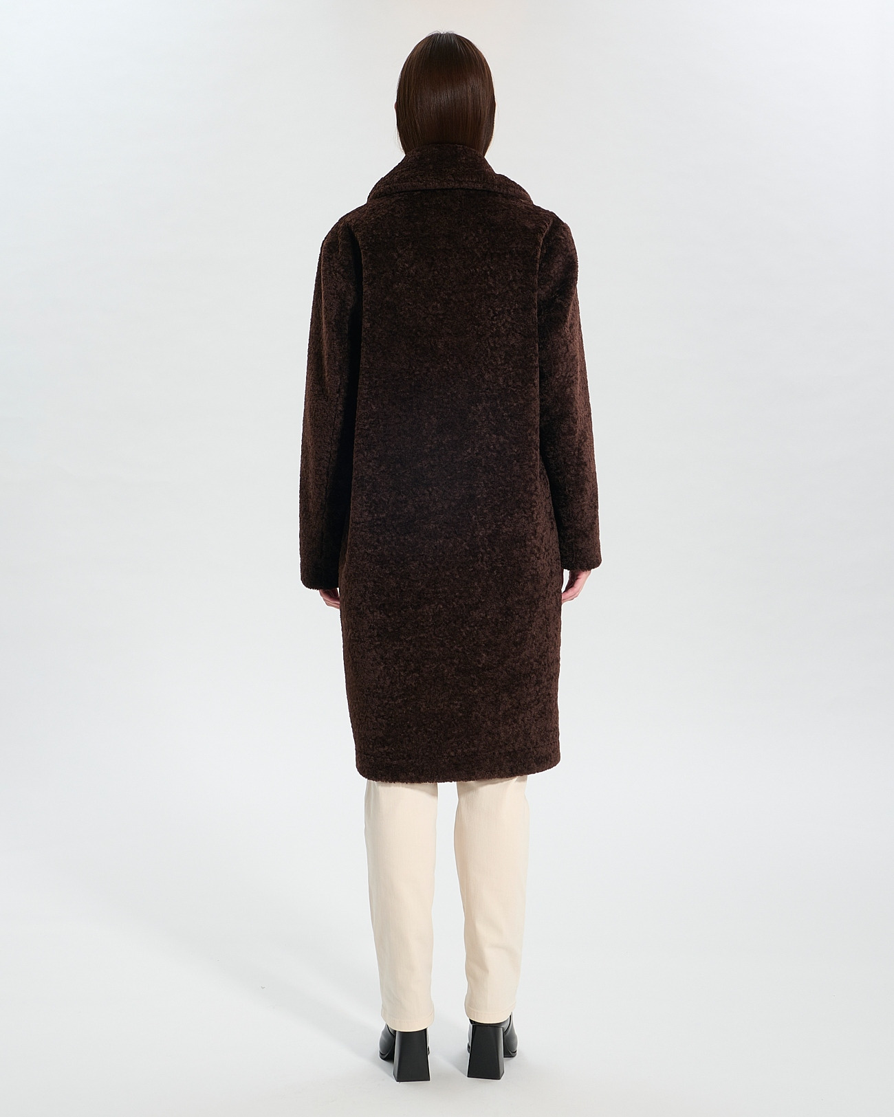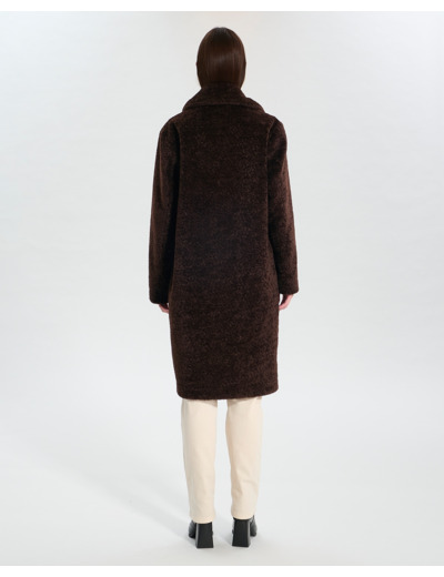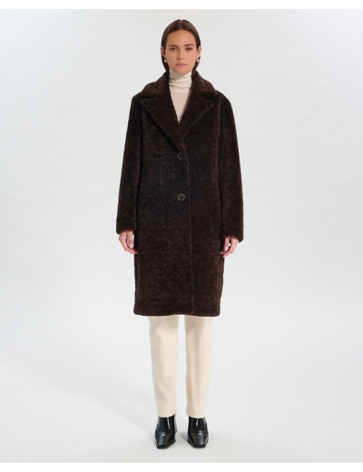 Manteau long à coupe droite en fourrure synthétique, fermeture boutonnée, deux poches en biais, coloris chocolat, longueur 100 cm. Composition 100% polyuréthane. Entretien : nettoyage à sec uniquement, ne pas laver, blanchir, repasser ni sécher en tambour.