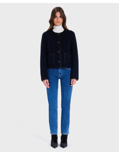 Cette veste courte à la coupe droite se distingue par son col rond et sa fermeture boutonnée, offrant une silhouette nette et structurée. La douceur du polyester associée à une doublure en simili-cuir assure confort et style, tandis que les deux poches plaquées ajoutent une touche pratique et esthétique.